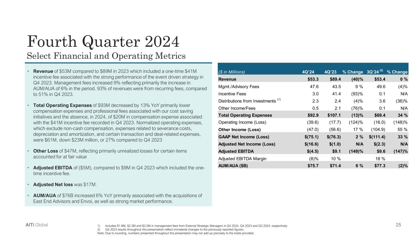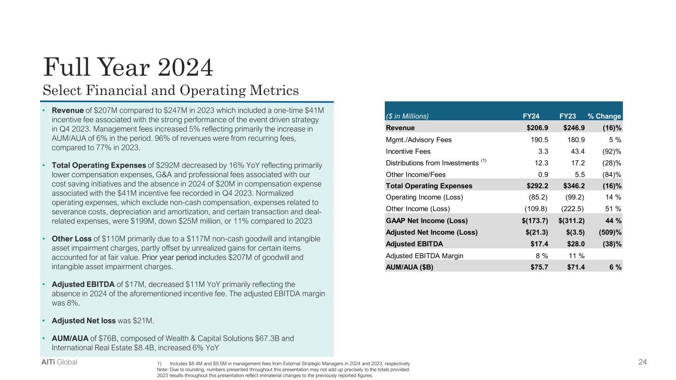 24AlTi Global Full Year 2024 Select Financial and Operating Metrics • Revenue of $207M compared to $247M in 2023 which included a one-time $41M incentive fee associated with the strong performance of the event driven strategy in Q4 2023. Management fees increased 5% reflecting primarily the increase in AUM/AUA of 6% in the period. 96% of revenues were from recurring fees, compared to 77% in 2023. • Total Operating Expenses of $292M decreased by 16% YoY reflecting primarily lower compensation expenses, G&A and professional fees associated with our cost saving initiatives and the absence in 2024 of $20M in compensation expense associated with the $41M incentive fee recorded in Q4 2023. Normalized operating expenses, which exclude non-cash compensation, expenses related to severance costs, depreciation and amortization, and certain transaction and deal- related expenses, were $199M, down $25M million, or 11% compared to 2023 • Other Loss of $110M primarily due to a $117M non-cash goodwill and intangible asset impairment charges, partly offset by unrealized gains for certain items accounted for at fair value. Prior year period includes $207M of goodwill and intangible asset impairment charges. • Adjusted EBITDA of $17M, decreased $11M YoY primarily reflecting the absence in 2024 of the aforementioned incentive fee. The adjusted EBITDA margin was 8%. • Adjusted Net loss was $21M. • AUM/AUA of $76B, composed of Wealth & Capital Solutions $67.3B and International Real Estate $8.4B, increased 6% YoY 1) Includes $8.4M and $9.5M in management fees from External Strategic Managers in 2024 and 2023, respectively Note: Due to rounding, numbers presented throughout this presentation may not add up precisely to the totals provided. 2023 results throughout this presentation reflect immaterial changes to the previously reported figures. ($ in Millions) FY24 FY23 % Change Revenue $206.9 $246.9 (16)% Mgmt./Advisory Fees 190.5 180.9 5 % Incentive Fees 3.3 43.4 (92)% Distributions from Investments (1) 12.3 17.2 (28)% Other Income/Fees 0.9 5.5 (84)% Total Operating Expenses $292.2 $346.2 (16)% Operating Income (Loss) (85.2) (99.2) 14 % Other Income (Loss) (109.8) (222.5) 51 % GAAP Net Income (Loss) $(173.7) $(311.2) 44 % Adjusted Net Income (Loss) $(21.3) $(3.5) (509)% Adjusted EBITDA $17.4 $28.0 (38)% Adjusted EBITDA Margin 8 % 11 % AUM/AUA ($B) $75.7 $71.4 6 %
