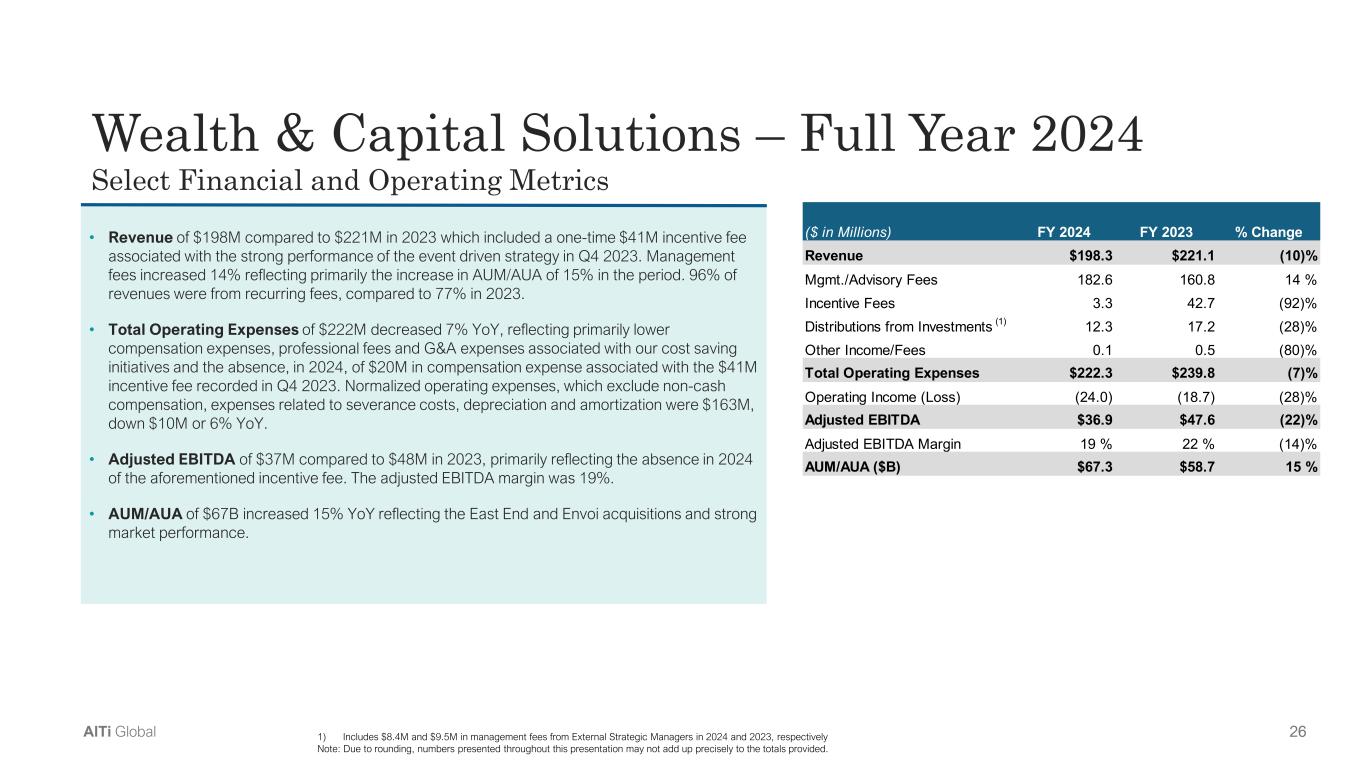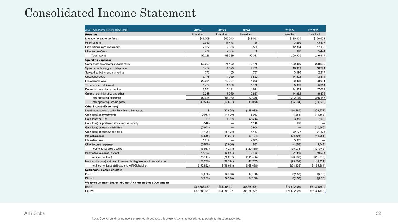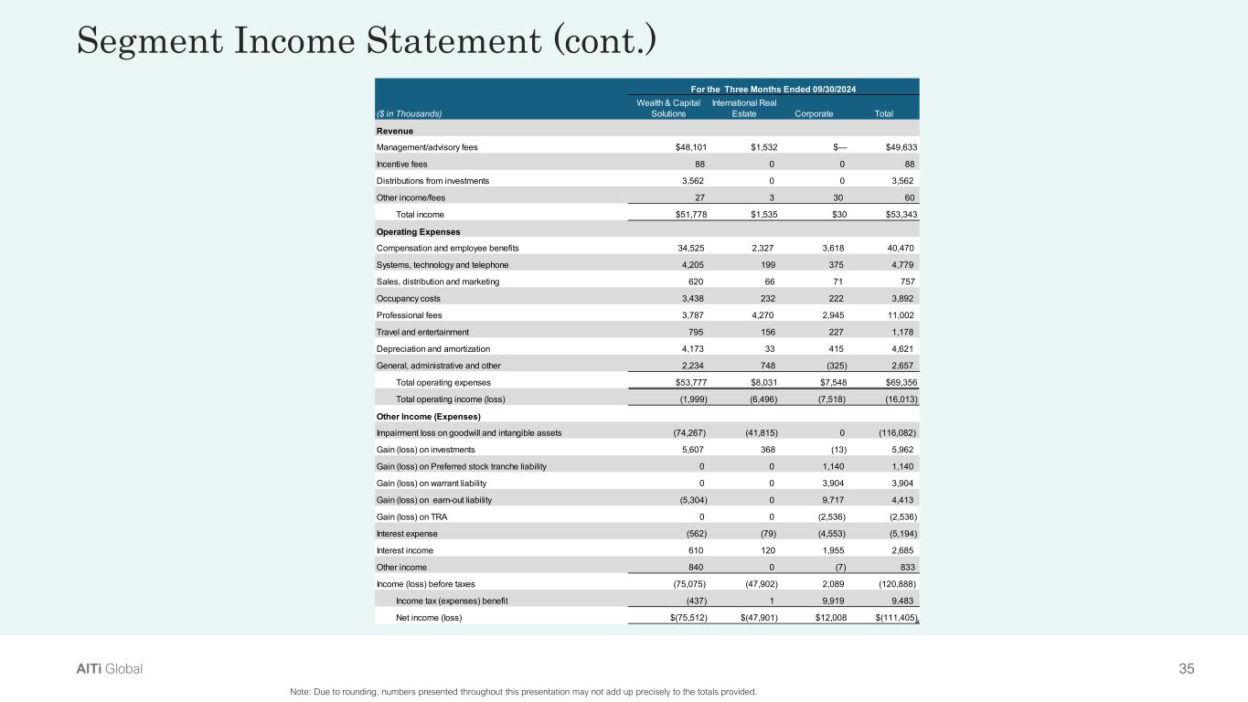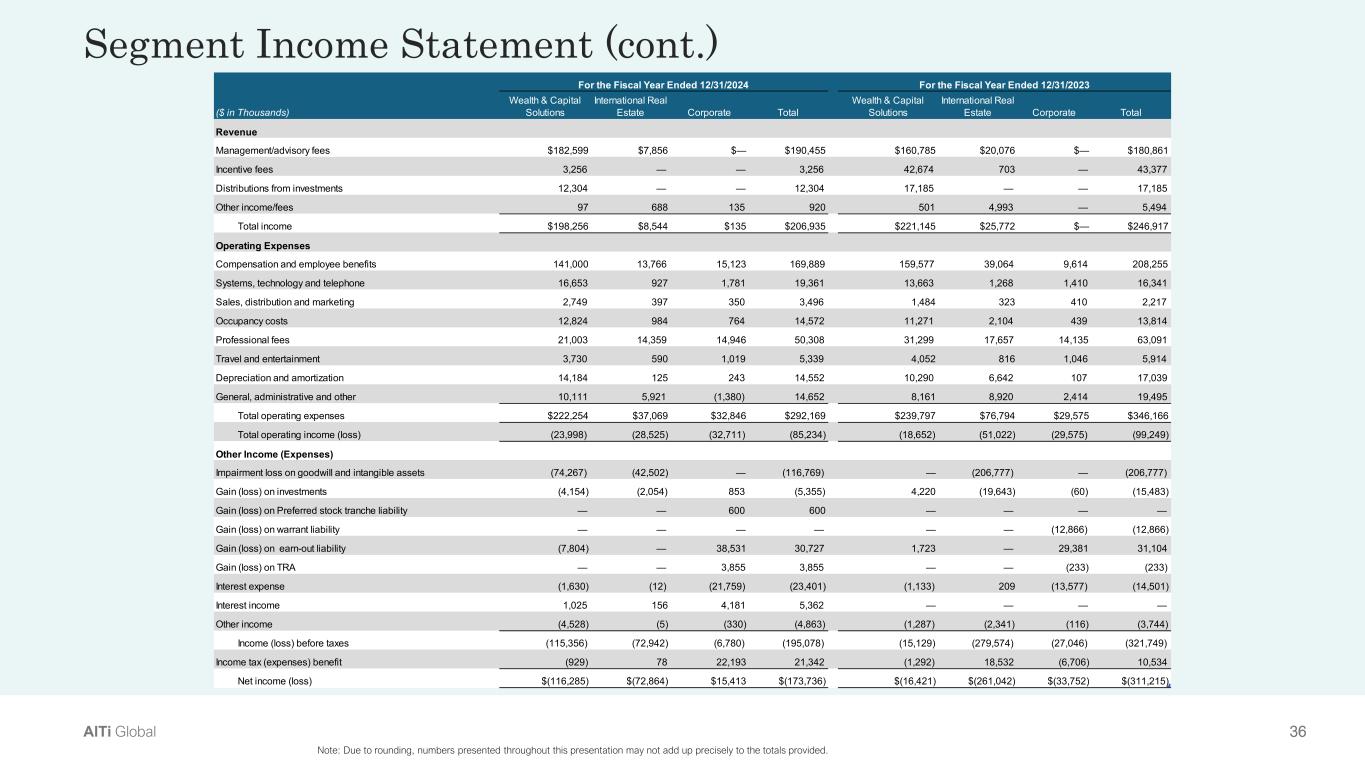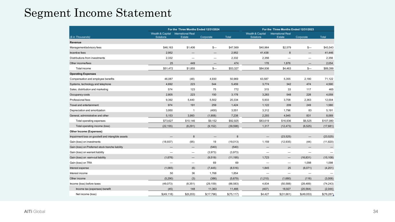 34AlTi Global Segment Income Statement ($ in Thousands) Wealth & Capital Solutions International Real Estate Corporate Total Wealth & Capital Solutions International Real Estate Corporate Total Revenue Management/advisory fees $46,163 $1,406 $— $47,569 $40,964 $2,579 $— $43,543 Incentive fees 2,952 — — 2,952 41,438 8 — 41,446 Distributions from investments 2,332 — — 2,332 2,356 — — 2,356 Other income/fees 25 449 — 474 178 1,876 — 2,054 Total income $51,472 $1,855 $— $53,327 $84,936 $4,463 $— $89,399 Operating Expenses Compensation and employee benefits 46,087 (48) 4,930 50,969 63,587 5,355 2,180 71,122 Systems, technology and telephone 4,692 223 544 5,459 3,774 342 474 4,590 Sales, distribution and marketing 574 123 75 772 315 33 117 465 Occupancy costs 2,805 223 150 3,178 3,283 548 228 4,059 Professional fees 9,392 5,440 5,502 20,334 5,933 3,708 2,363 12,004 Travel and entertainment 974 191 259 1,424 1,122 209 249 1,580 Depreciation and amortization 3,950 1 (400) 3,551 3,312 1,796 83 5,191 General, administrative and other 5,153 3,993 (1,908) 7,238 2,293 4,945 831 8,069 Total operating expenses $73,627 $10,146 $9,152 $92,925 $83,619 $16,936 $6,525 $107,080 Total operating income (loss) (22,155) (8,291) (9,152) (39,598) 1,317 (12,473) (6,525) (17,681) Other Income (Expenses) Impairment loss on goodwill and intangible assets — 8 — 8 — (23,525) — (23,525) Gain (loss) on investments (18,937) (95) 19 (19,013) 1,159 (12,935) (44) (11,820) Gain (loss) on Preferred stock tranche liability — — (540) (540) — — — — Gain (loss) on warrant liability — — (3,973) (3,973) — — — — Gain (loss) on earn-out liability (1,676) — (9,519) (11,195) 1,723 — (16,831) (15,108) Gain (loss) on TRA — — 69 69 — — 1,098 1,098 Interest expense (1,065) (6) (7,445) (8,516) 1,845 25 (6,071) (4,201) Interest income 50 36 1,768 1,854 — — — — Other income (5,290) (3) (386) (5,679) (1,210) (1,680) (116) (3,006) Income (loss) before taxes (49,073) (8,351) (29,159) (86,583) 4,834 (50,588) (28,489) (74,243) Income tax (expenses) benefit (45) 148 11,363 11,466 (407) 18,927 (20,564) (2,044) Net income (loss) $(49,118) $(8,203) $(17,796) $(75,117) $4,427 $(31,661) $(49,053) $(76,287) For the Three Months Ended 12/31/2024 For the Three Months Ended 12/31/2023