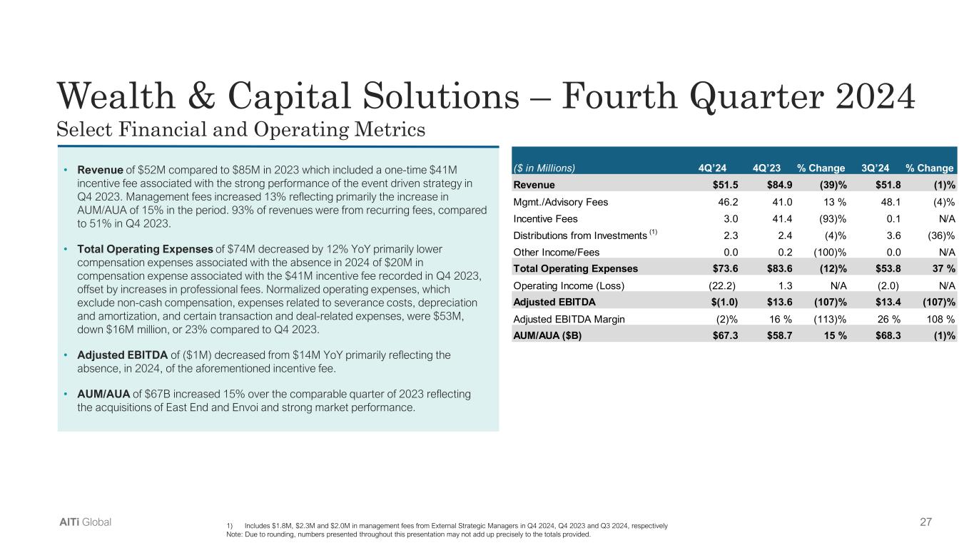 26AlTi Global • Revenue of $198M compared to $221M in 2023 which included a one-time $41M incentive fee associated with the strong performance of the event driven strategy in Q4 2023. Management fees increased 14% reflecting primarily the increase in AUM/AUA of 15% in the period. 96% of revenues were from recurring fees, compared to 77% in 2023. • Total Operating Expenses of $222M decreased 7% YoY, reflecting primarily lower compensation expenses, professional fees and G&A expenses associated with our cost saving initiatives and the absence, in 2024, of $20M in compensation expense associated with the $41M incentive fee recorded in Q4 2023. Normalized operating expenses, which exclude non-cash compensation, expenses related to severance costs, depreciation and amortization were $163M, down $10M or 6% YoY. • Adjusted EBITDA of $37M compared to $48M in 2023, primarily reflecting the absence in 2024 of the aforementioned incentive fee. The adjusted EBITDA margin was 19%. • AUM/AUA of $67B increased 15% YoY reflecting the East End and Envoi acquisitions and strong market performance. Wealth & Capital Solutions – Full Year 2024 Select Financial and Operating Metrics 1) Includes $8.4M and $9.5M in management fees from External Strategic Managers in 2024 and 2023, respectively Note: Due to rounding, numbers presented throughout this presentation may not add up precisely to the totals provided. ($ in Millions) FY 2024 FY 2023 % Change Revenue $198.3 $221.1 (10)% Mgmt./Advisory Fees 182.6 160.8 14 % Incentive Fees 3.3 42.7 (92)% Distributions from Investments (1) 12.3 17.2 (28)% Other Income/Fees 0.1 0.5 (80)% Total Operating Expenses $222.3 $239.8 (7)% Operating Income (Loss) (24.0) (18.7) (28)% Adjusted EBITDA $36.9 $47.6 (22)% Adjusted EBITDA Margin 19 % 22 % (14)% AUM/AUA ($B) $67.3 $58.7 15 %
