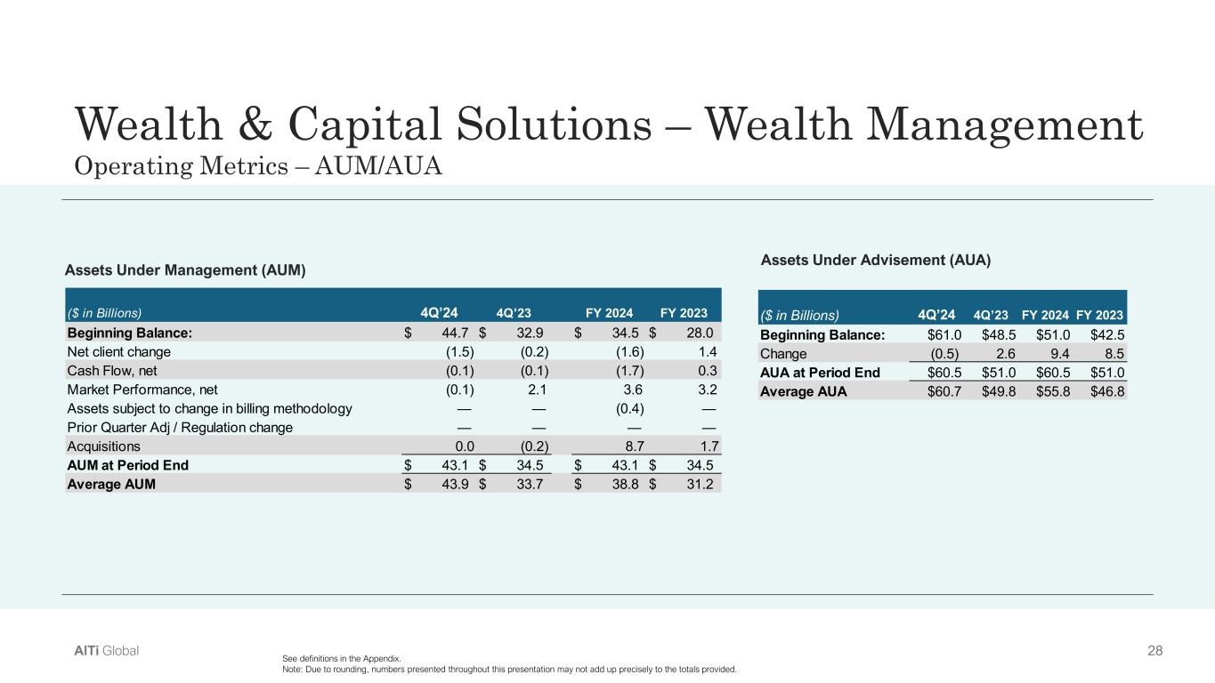 27AlTi Global • Revenue of $52M compared to $85M in 2023 which included a one-time $41M incentive fee associated with the strong performance of the event driven strategy in Q4 2023. Management fees increased 13% reflecting primarily the increase in AUM/AUA of 15% in the period. 93% of revenues were from recurring fees, compared to 51% in Q4 2023. • Total Operating Expenses of $74M decreased by 12% YoY primarily lower compensation expenses associated with the absence in 2024 of $20M in compensation expense associated with the $41M incentive fee recorded in Q4 2023, offset by increases in professional fees. Normalized operating expenses, which exclude non-cash compensation, expenses related to severance costs, depreciation and amortization, and certain transaction and deal-related expenses, were $53M, down $16M million, or 23% compared to Q4 2023. • Adjusted EBITDA of ($1M) decreased from $14M YoY primarily reflecting the absence, in 2024, of the aforementioned incentive fee. • AUM/AUA of $67B increased 15% over the comparable quarter of 2023 reflecting the acquisitions of East End and Envoi and strong market performance. Wealth & Capital Solutions – Fourth Quarter 2024 Select Financial and Operating Metrics 1) Includes $1.8M, $2.3M and $2.0M in management fees from External Strategic Managers in Q4 2024, Q4 2023 and Q3 2024, respectively Note: Due to rounding, numbers presented throughout this presentation may not add up precisely to the totals provided. ($ in Millions) 4Q’24 4Q’23 % Change 3Q’24 % Change Revenue $51.5 $84.9 (39)% $51.8 (1)% Mgmt./Advisory Fees 46.2 41.0 13 % 48.1 (4)% Incentive Fees 3.0 41.4 (93)% 0.1 N/A Distributions from Investments (1) 2.3 2.4 (4)% 3.6 (36)% Other Income/Fees 0.0 0.2 (100)% 0.0 N/A Total Operating Expenses $73.6 $83.6 (12)% $53.8 37 % Operating Income (Loss) (22.2) 1.3 N/A (2.0) N/A Adjusted EBITDA $(1.0) $13.6 (107)% $13.4 (107)% Adjusted EBITDA Margin (2)% 16 % (113)% 26 % 108 % AUM/AUA ($B) $67.3 $58.7 15 % $68.3 (1)%