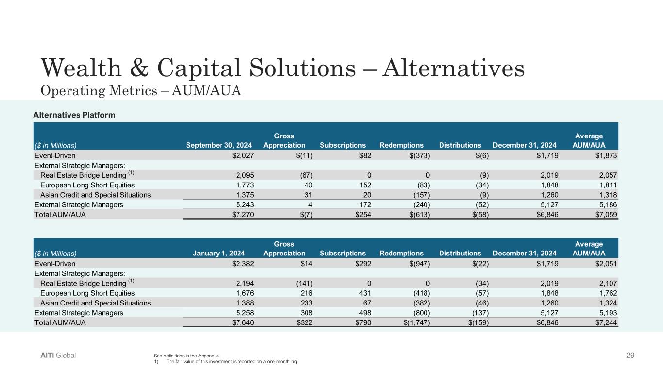 28AlTi Global Wealth & Capital Solutions – Wealth Management Operating Metrics – AUM/AUA Assets Under Management (AUM) See definitions in the Appendix. Note: Due to rounding, numbers presented throughout this presentation may not add up precisely to the totals provided. ($ in Billions) 4Q’24 4Q’23 FY 2024 FY 2023 Beginning Balance: $ 44.7 $ 32.9 $ 34.5 $ 28.0 Net client change (1.5) (0.2) (1.6) 1.4 Cash Flow, net (0.1) (0.1) (1.7) 0.3 Market Performance, net (0.1) 2.1 3.6 3.2 Assets subject to change in billing methodology — — (0.4) — Prior Quarter Adj / Regulation change — — — — Acquisitions 0.0 (0.2) 8.7 1.7 AUM at Period End $ 43.1 $ 34.5 $ 43.1 $ 34.5 Average AUM $ 43.9 $ 33.7 $ 38.8 $ 31.2 Assets Under Advisement (AUA) ($ in Billions) 4Q’24 4Q’23 FY 2024 FY 2023 Beginning Balance: $61.0 $48.5 $51.0 $42.5 Change (0.5) 2.6 9.4 8.5 AUA at Period End $60.5 $51.0 $60.5 $51.0 Average AUA $60.7 $49.8 $55.8 $46.8