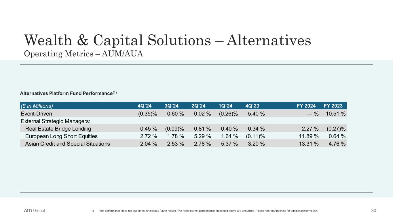 29AlTi Global Wealth & Capital Solutions – Alternatives Operating Metrics – AUM/AUA Alternatives Platform See definitions in the Appendix. 1) The fair value of this investment is reported on a one-month lag. ($ in Millions) September 30, 2024 Gross Appreciation Subscriptions Redemptions Distributions December 31, 2024 Average AUM/AUA Event-Driven $2,027 $(11) $82 $(373) $(6) $1,719 $1,873 External Strategic Managers: Real Estate Bridge Lending (1) 2,095 (67) 0 0 (9) 2,019 2,057 European Long Short Equities 1,773 40 152 (83) (34) 1,848 1,811 Asian Credit and Special Situations 1,375 31 20 (157) (9) 1,260 1,318 External Strategic Managers 5,243 4 172 (240) (52) 5,127 5,186 Total AUM/AUA $7,270 $(7) $254 $(613) $(58) $6,846 $7,059 ($ in Millions) January 1, 2024 Gross Appreciation Subscriptions Redemptions Distributions December 31, 2024 Average AUM/AUA Event-Driven $2,382 $14 $292 $(947) $(22) $1,719 $2,051 External Strategic Managers: Real Estate Bridge Lending (1) 2,194 (141) 0 0 (34) 2,019 2,107 European Long Short Equities 1,676 216 431 (418) (57) 1,848 1,762 Asian Credit and Special Situations 1,388 233 67 (382) (46) 1,260 1,324 External Strategic Managers 5,258 308 498 (800) (137) 5,127 5,193 Total AUM/AUA $7,640 $322 $790 $(1,747) $(159) $6,846 $7,244