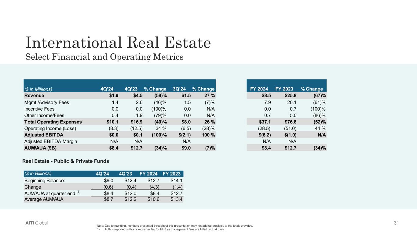 31AlTi Global International Real Estate Select Financial and Operating Metrics Real Estate - Public & Private Funds Note: Due to rounding, numbers presented throughout this presentation may not add up precisely to the totals provided. 1) AUA is reported with a one-quarter lag for HLIF as management fees are billed on that basis. ($ in Billions) 4Q’24 4Q’23 FY 2024 FY 2023 Beginning Balance: $9.0 $12.4 $12.7 $14.1 Change (0.6) (0.4) (4.3) (1.4) AUM/AUA at quarter end (1) $8.4 $12.0 $8.4 $12.7 Average AUM/AUA $8.7 $12.2 $10.6 $13.4 ($ in Millions) 4Q’24 4Q’23 % Change 3Q’24 % Change FY 2024 FY 2023 % Change Revenue $1.9 $4.5 (58)% $1.5 27 % $8.5 $25.8 (67)% Mgmt./Advisory Fees 1.4 2.6 (46)% 1.5 (7)% 7.9 20.1 (61)% Incentive Fees 0.0 0.0 (100)% 0.0 N/A 0.0 0.7 (100)% Other Income/Fees 0.4 1.9 (79)% 0.0 N/A 0.7 5.0 (86)% Total Operating Expenses $10.1 $16.9 (40)% $8.0 26 % $37.1 $76.8 (52)% Operating Income (Loss) (8.3) (12.5) 34 % (6.5) (28)% (28.5) (51.0) 44 % Adjusted EBITDA $0.0 $0.1 (100)% $(2.1) 100 % $(6.2) $(1.0) N/A Adjusted EBITDA Margin N/A N/A N/A N/A N/A AUM/AUA ($B) $8.4 $12.7 (34)% $9.0 (7)% $8.4 $12.7 (34)%