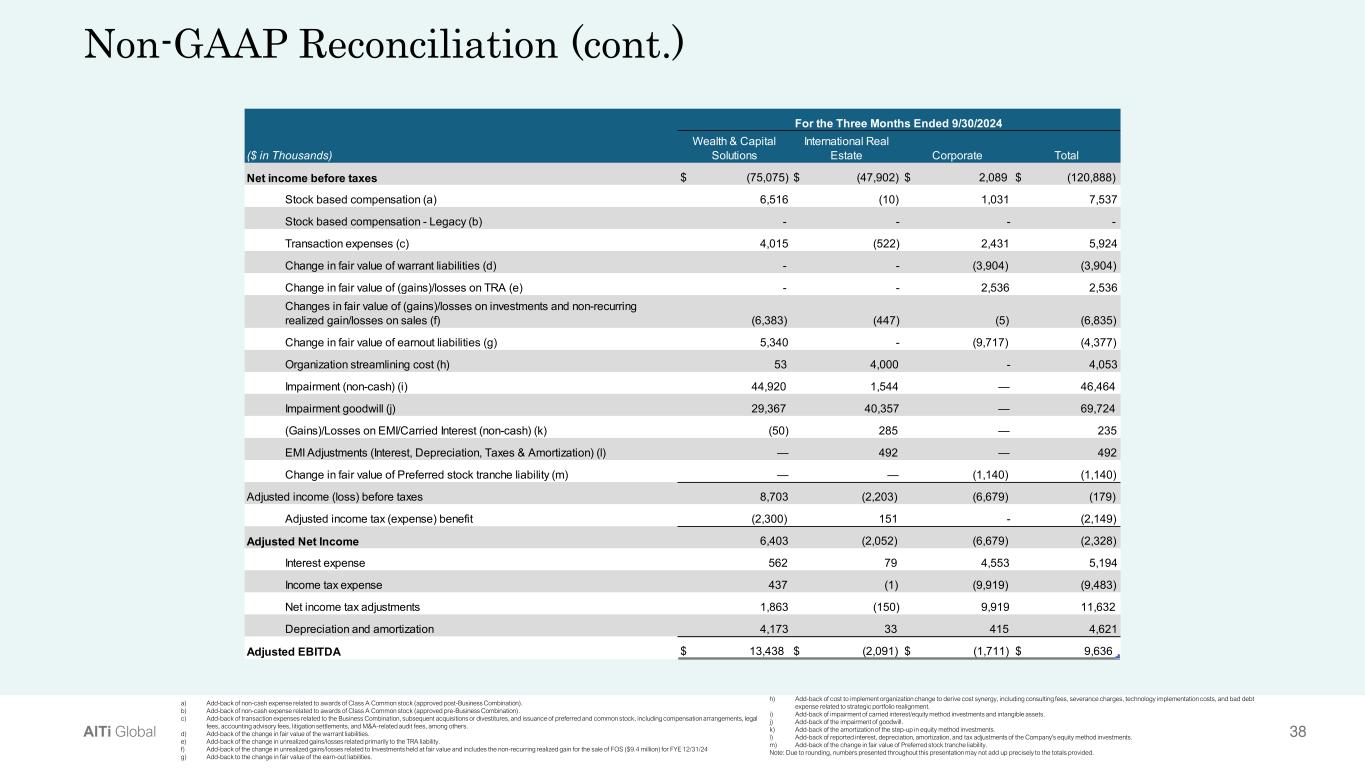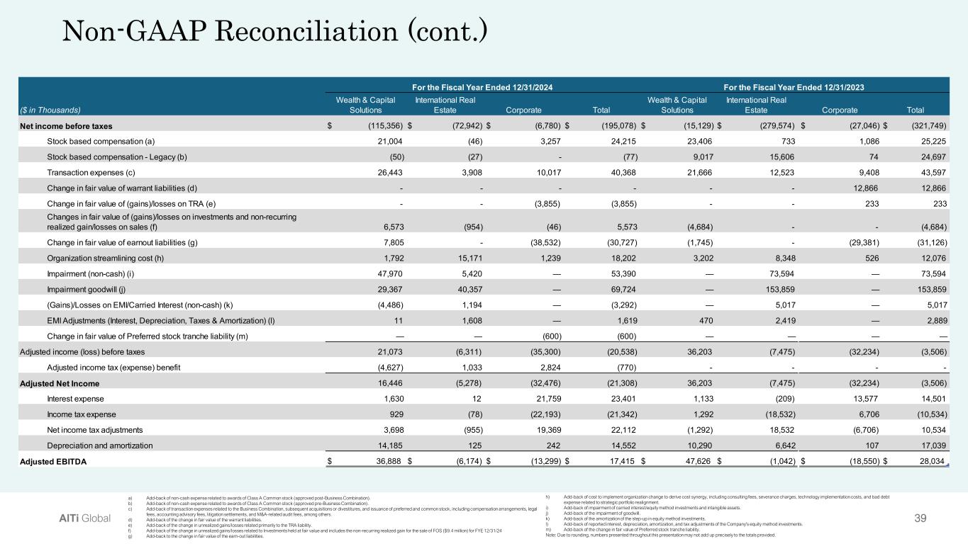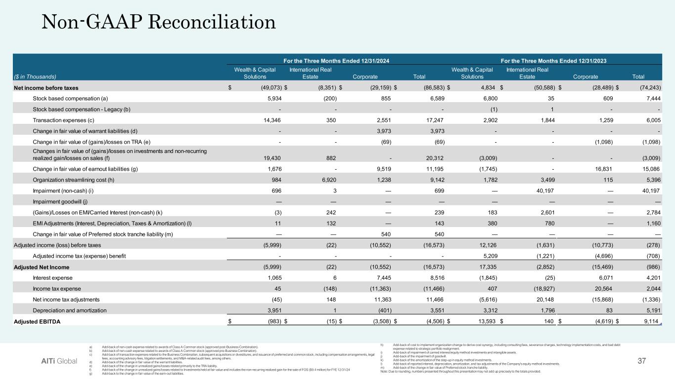 37AlTi Global h) Add-back of cost to implement organization change to derive cost synergy, including consulting fees, severance charges, technology implementation costs, and bad debt expense related to strategic portfolio realignment. i) Add-back of impairment of carried interest/equity method investments and intangible assets. j) Add-back of the impairment of goodwill. k) Add-back of the amortization of the step-up in equity method investments. l) Add-back of reported interest, depreciation, amortization, and tax adjustments of the Company's equity method investments. m) Add-back of the change in fair value of Preferred stock tranche liability. Note: Due to rounding, numbers presented throughout this presentation may not add up precisely to the totals provided. Non-GAAP Reconciliation a) Add-back of non-cash expense related to awards of Class A Common stock (approved post-Business Combination). b) Add-back of non-cash expense related to awards of Class A Common stock (approved pre-Business Combination). c) Add-back of transaction expenses related to the Business Combination, subsequent acquisitions or divestitures, and issuance of preferred and common stock, including compensation arrangements, legal fees, accounting advisory fees, litigation settlements, and M&A-related audit fees, among others. d) Add-back of the change in fair value of the warrant liabilities. e) Add-back of the change in unrealized gains/losses related primarily to the TRA liability. f) Add-back of the change in unrealized gains/losses related to Investments held at fair value and includes the non-recurring realized gain for the sale of FOS ($9.4 million) for FYE 12/31/24 g) Add-back to the change in fair value of the earn-out liabilities. ($ in Thousands) Wealth & Capital Solutions International Real Estate Corporate Total Wealth & Capital Solutions International Real Estate Corporate Total Net income before taxes $ (49,073) $ (8,351) $ (29,159) $ (86,583) $ 4,834 $ (50,588) $ (28,489) $ (74,243) Stock based compensation (a) 5,934 (200) 855 6,589 6,800 35 609 7,444 Stock based compensation - Legacy (b) - - - - (1) 1 - - Transaction expenses (c) 14,346 350 2,551 17,247 2,902 1,844 1,259 6,005 Change in fair value of warrant liabilities (d) - - 3,973 3,973 - - - - Change in fair value of (gains)/losses on TRA (e) - - (69) (69) - - (1,098) (1,098) Changes in fair value of (gains)/losses on investments and non-recurring realized gain/losses on sales (f) 19,430 882 - 20,312 (3,009) - - (3,009) Change in fair value of earnout liabilities (g) 1,676 - 9,519 11,195 (1,745) - 16,831 15,086 Organization streamlining cost (h) 984 6,920 1,238 9,142 1,782 3,499 115 5,396 Impairment (non-cash) (i) 696 3 — 699 — 40,197 — 40,197 Impairment goodwill (j) — — — — — — — — (Gains)/Losses on EMI/Carried Interest (non-cash) (k) (3) 242 — 239 183 2,601 — 2,784 EMI Adjustments (Interest, Depreciation, Taxes & Amortization) (l) 11 132 — 143 380 780 — 1,160 Change in fair value of Preferred stock tranche liability (m) — — 540 540 — — — — Adjusted income (loss) before taxes (5,999) (22) (10,552) (16,573) 12,126 (1,631) (10,773) (278) Adjusted income tax (expense) benefit - - - - 5,209 (1,221) (4,696) (708) Adjusted Net Income (5,999) (22) (10,552) (16,573) 17,335 (2,852) (15,469) (986) Interest expense 1,065 6 7,445 8,516 (1,845) (25) 6,071 4,201 Income tax expense 45 (148) (11,363) (11,466) 407 (18,927) 20,564 2,044 Net income tax adjustments (45) 148 11,363 11,466 (5,616) 20,148 (15,868) (1,336) Depreciation and amortization 3,951 1 (401) 3,551 3,312 1,796 83 5,191 Adjusted EBITDA $ (983) $ (15) $ (3,508) $ (4,506) $ 13,593 $ 140 $ (4,619) $ 9,114 For the Three Months Ended 12/31/2024 For the Three Months Ended 12/31/2023