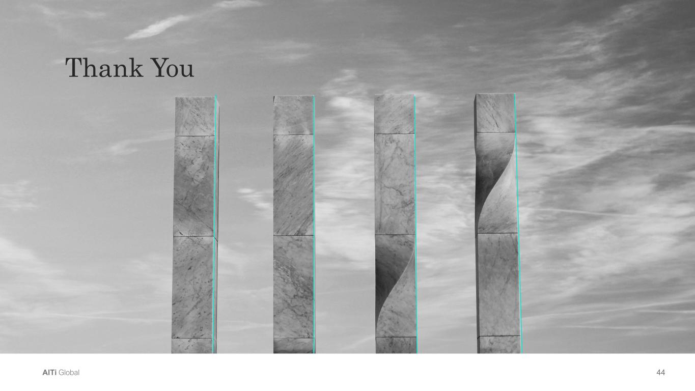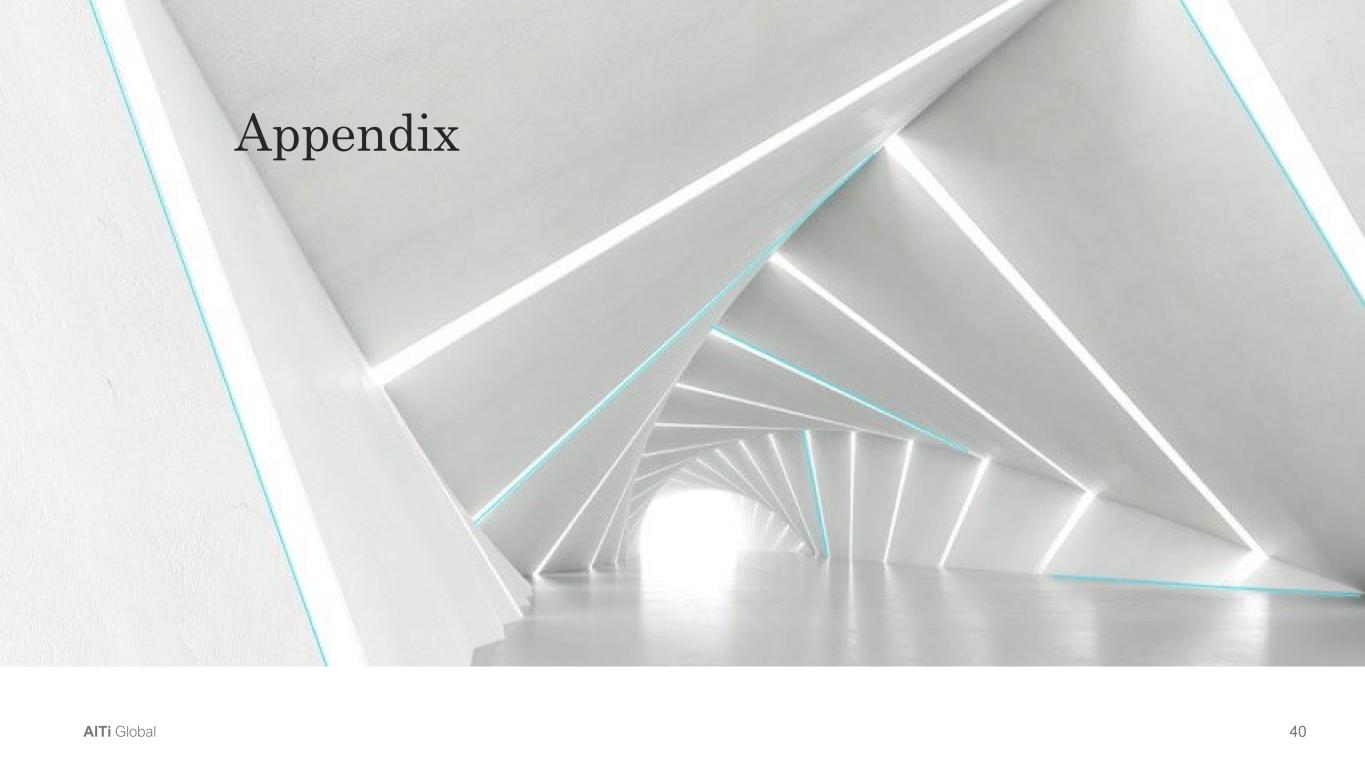 39AlTi Global Non-GAAP Reconciliation (cont.) h) Add-back of cost to implement organization change to derive cost synergy, including consulting fees, severance charges, technology implementation costs, and bad debt expense related to strategic portfolio realignment. i) Add-back of impairment of carried interest/equity method investments and intangible assets. j) Add-back of the impairment of goodwill. k) Add-back of the amortization of the step-up in equity method investments. l) Add-back of reported interest, depreciation, amortization, and tax adjustments of the Company's equity method investments. m) Add-back of the change in fair value of Preferred stock tranche liability. Note: Due to rounding, numbers presented throughout this presentation may not add up precisely to the totals provided. a) Add-back of non-cash expense related to awards of Class A Common stock (approved post-Business Combination). b) Add-back of non-cash expense related to awards of Class A Common stock (approved pre-Business Combination). c) Add-back of transaction expenses related to the Business Combination, subsequent acquisitions or divestitures, and issuance of preferred and common stock, including compensation arrangements, legal fees, accounting advisory fees, litigation settlements, and M&A-related audit fees, among others. d) Add-back of the change in fair value of the warrant liabilities. e) Add-back of the change in unrealized gains/losses related primarily to the TRA liability. f) Add-back of the change in unrealized gains/losses related to Investments held at fair value and includes the non-recurring realized gain for the sale of FOS ($9.4 million) for FYE 12/31/24 g) Add-back to the change in fair value of the earn-out liabilities. ($ in Thousands) Wealth & Capital Solutions International Real Estate Corporate Total Wealth & Capital Solutions International Real Estate Corporate Total Net income before taxes $ (115,356) $ (72,942) $ (6,780) $ (195,078) $ (15,129) $ (279,574) $ (27,046) $ (321,749) Stock based compensation (a) 21,004 (46) 3,257 24,215 23,406 733 1,086 25,225 Stock based compensation - Legacy (b) (50) (27) - (77) 9,017 15,606 74 24,697 Transaction expenses (c) 26,443 3,908 10,017 40,368 21,666 12,523 9,408 43,597 Change in fair value of warrant liabilities (d) - - - - - - 12,866 12,866 Change in fair value of (gains)/losses on TRA (e) - - (3,855) (3,855) - - 233 233 Changes in fair value of (gains)/losses on investments and non-recurring realized gain/losses on sales (f) 6,573 (954) (46) 5,573 (4,684) - - (4,684) Change in fair value of earnout liabilities (g) 7,805 - (38,532) (30,727) (1,745) - (29,381) (31,126) Organization streamlining cost (h) 1,792 15,171 1,239 18,202 3,202 8,348 526 12,076 Impairment (non-cash) (i) 47,970 5,420 — 53,390 — 73,594 — 73,594 Impairment goodwill (j) 29,367 40,357 — 69,724 — 153,859 — 153,859 (Gains)/Losses on EMI/Carried Interest (non-cash) (k) (4,486) 1,194 — (3,292) — 5,017 — 5,017 EMI Adjustments (Interest, Depreciation, Taxes & Amortization) (l) 11 1,608 — 1,619 470 2,419 — 2,889 Change in fair value of Preferred stock tranche liability (m) — — (600) (600) — — — — Adjusted income (loss) before taxes 21,073 (6,311) (35,300) (20,538) 36,203 (7,475) (32,234) (3,506) Adjusted income tax (expense) benefit (4,627) 1,033 2,824 (770) - - - - Adjusted Net Income 16,446 (5,278) (32,476) (21,308) 36,203 (7,475) (32,234) (3,506) Interest expense 1,630 12 21,759 23,401 1,133 (209) 13,577 14,501 Income tax expense 929 (78) (22,193) (21,342) 1,292 (18,532) 6,706 (10,534) Net income tax adjustments 3,698 (955) 19,369 22,112 (1,292) 18,532 (6,706) 10,534 Depreciation and amortization 14,185 125 242 14,552 10,290 6,642 107 17,039 Adjusted EBITDA $ 36,888 $ (6,174) $ (13,299) $ 17,415 $ 47,626 $ (1,042) $ (18,550) $ 28,034 For the Fiscal Year Ended 12/31/2024 For the Fiscal Year Ended 12/31/2023