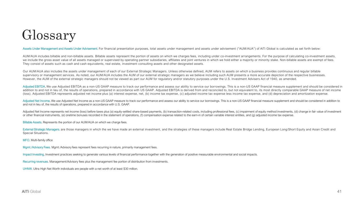 41AlTi Global Glossary Assets Under Management and Assets Under Advisement. For financial presentation purposes, total assets under management and assets under advisement (“AUM/AUA”) of AlTi Global is calculated as set forth below: AUM/AUA includes billable and non-billable assets. Billable assets represent the portion of assets on which we charges fees, including under co-investment arrangements. For the purpose of calculating co-investment assets, we include the gross asset value of all assets managed or supervised by operating partner subsidiaries, affiliates and joint ventures in which we hold either a majority or minority stake. Non-billable assets are exempt of fees. They consist of assets such as cash and cash equivalents, real estate, investment consulting assets and other designated assets. Our AUM/AUA also includes the assets under management of each of our External Strategic Managers. Unless otherwise defined, AUM refers to assets on which a business provides continuous and regular billable supervisory or management services. As noted, our AUM/AUA includes the AUM of our external strategic managers as we believe including such AUM presents a more accurate depiction of the respective businesses. However, the AUM of the external strategic managers should not be viewed as part our AUM for regulatory and/or statutory purposes under the U.S. Investment Advisers Act of 1940, as amended. Adjusted EBITDA. We use Adjusted EBITDA as a non-US GAAP measure to track our performance and assess our ability to service our borrowings. This is a non-US GAAP financial measure supplement and should be considered in addition to and not in lieu of, the results of operations, prepared in accordance with US GAAP. Adjusted EBITDA is derived from and reconciled to, but not equivalent to, its most directly comparable GAAP measure of net income (loss). Adjusted EBITDA represents adjusted net income plus (a) interest expense, net, (b) income tax expense, (c) adjusted income tax expense less income tax expense, and (d) depreciation and amortization expense. Adjusted Net Income. We use Adjusted Net Income as a non-US GAAP measure to track our performance and assess our ability to service our borrowings. This is a non-US GAAP financial measure supplement and should be considered in addition to and not in lieu of, the results of operations, prepared in accordance with U.S. GAAP. Adjusted Net Income represents net income (loss) before taxes plus (a) equity-settled share-based payments, (b) transaction-related costs, including professional fees, (c) impairment of equity method investments, (d) change in fair value of investment or other financial instruments, (e) onetime bonuses recorded in the statement of operations, (f) compensation expense related to the earn-in of certain variable interest entities, and (g) adjusted income tax expense. Billable Assets. Represents the portion of our AUM/AUA on which we charge fees. External Strategic Managers. are those managers in which the we have made an external investment, and the strategies of these managers include Real Estate Bridge Lending, European Long/Short Equity and Asian Credit and Special Situations. MFO. Multi-family office Mgmt./Advisory Fees. Mgmt./Advisory fees represent fees recurring in nature, primarily management fees. Impact Investing. Investment practices seeking to generate various levels of financial performance together with the generation of positive measurable environmental and social impacts. Recurring revenues. Management/Advisory fees plus the management fee portion of distribution from investments. UHNW. Ultra High Net Worth individuals are people with a net worth of at least $30 million.