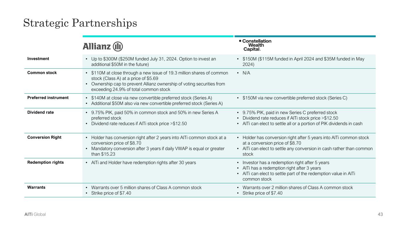 43AlTi Global Investment • Up to $300M ($250M funded July 31, 2024. Option to invest an additional $50M in the future) • $150M ($115M funded in April 2024 and $35M funded in May 2024) Common stock • $110M at close through a new issue of 19.3 million shares of common stock (Class A) at a price of $5.69 • Ownership cap to prevent Allianz ownership of voting securities from exceeding 24.9% of total common stock • N/A Preferred instrument • $140M at close via new convertible preferred stock (Series A) • Additional $50M also via new convertible preferred stock (Series A) • $150M via new convertible preferred stock (Series C) Dividend rate • 9.75% PIK, paid 50% in common stock and 50% in new Series A preferred stock • Dividend rate reduces if AlTi stock price >$12.50 • 9.75% PIK, paid in new Series C preferred stock • Dividend rate reduces if AlTi stock price >$12.50 • AlTi can elect to settle all or a portion of PIK dividends in cash Conversion Right • Holder has conversion right after 2 years into AlTi common stock at a conversion price of $8.70 • Mandatory conversion after 3 years if daily VWAP is equal or greater than $15.23 • Holder has conversion right after 5 years into AlTi common stock at a conversion price of $8.70 • AlTi can elect to settle any conversion in cash rather than common stock Redemption rights • AlTi and Holder have redemption rights after 30 years • Investor has a redemption right after 5 years • AlTi has a redemption right after 3 years • AlTi can elect to settle part of the redemption value in AlTi common stock Warrants • Warrants over 5 million shares of Class A common stock • Strike price of $7.40 • Warrants over 2 million shares of Class A common stock • Strike price of $7.40 Strategic Partnerships