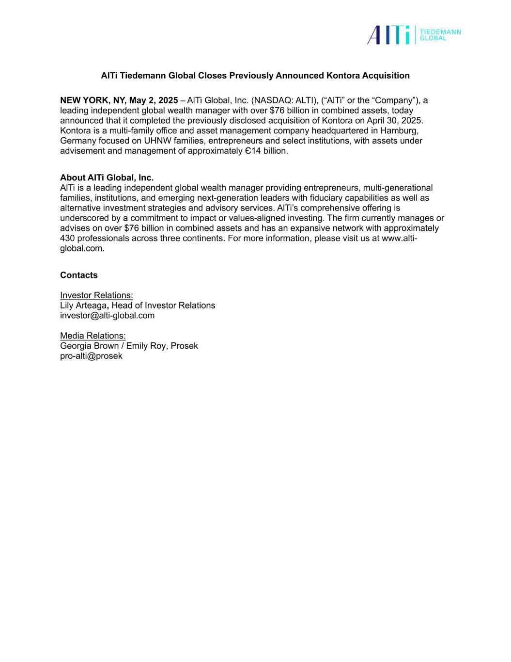AlTi Tiedemann Global Closes Previously Announced Kontora Acquisition NEW YORK, NY, May 2, 2025 – AlTi Global, Inc. (NASDAQ: ALTI), (“AlTi” or the “Company”), a leading independent global wealth manager with over $76 billion in combined assets, today announced that it completed the previously disclosed acquisition of Kontora on April 30, 2025. Kontora is a multi-family office and asset management company headquartered in Hamburg, Germany focused on UHNW families, entrepreneurs and select institutions, with assets under advisement and management of approximately Є14 billion. About AlTi Global, Inc. AlTi is a leading independent global wealth manager providing entrepreneurs, multi-generational families, institutions, and emerging next-generation leaders with fiduciary capabilities as well as alternative investment strategies and advisory services. AlTi’s comprehensive offering is underscored by a commitment to impact or values-aligned investing. The firm currently manages or advises on over $76 billion in combined assets and has an expansive network with approximately 430 professionals across three continents. For more information, please visit us at www.alti- global.com. Contacts Investor Relations: Lily Arteaga, Head of Investor Relations investor@alti-global.com Media Relations: Georgia Brown / Emily Roy, Prosek pro-alti@prosek
