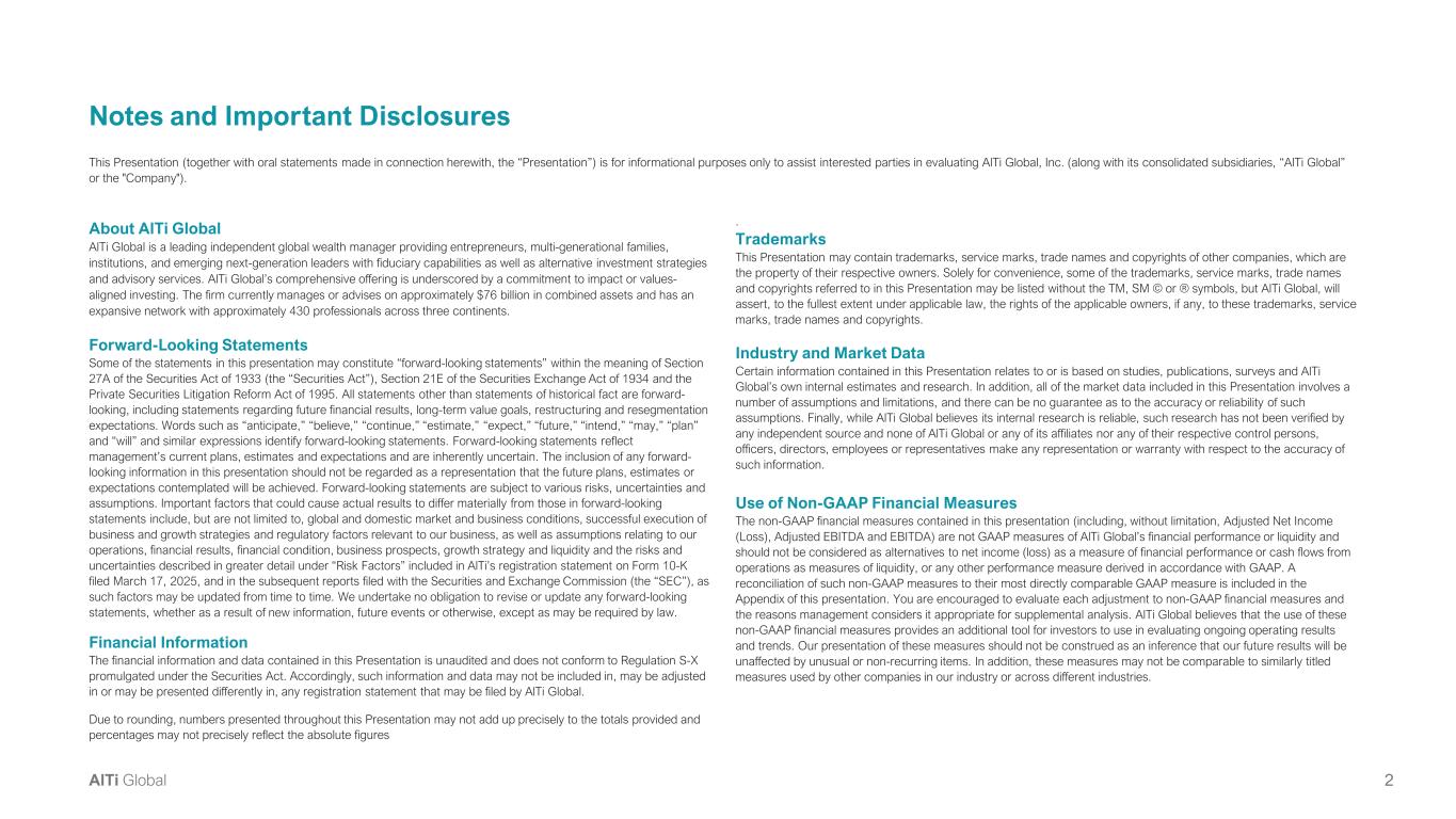 2AlTi Global Notes and Important Disclosures About AlTi Global AlTi Global is a leading independent global wealth manager providing entrepreneurs, multi-generational families, institutions, and emerging next-generation leaders with fiduciary capabilities as well as alternative investment strategies and advisory services. AlTi Global’s comprehensive offering is underscored by a commitment to impact or values- aligned investing. The firm currently manages or advises on approximately $76 billion in combined assets and has an expansive network with approximately 430 professionals across three continents. Forward-Looking Statements Some of the statements in this presentation may constitute “forward-looking statements” within the meaning of Section 27A of the Securities Act of 1933 (the “Securities Act”), Section 21E of the Securities Exchange Act of 1934 and the Private Securities Litigation Reform Act of 1995. All statements other than statements of historical fact are forward- looking, including statements regarding future financial results, long-term value goals, restructuring and resegmentation expectations. Words such as “anticipate,” “believe,” “continue,” “estimate,” “expect,” “future,” “intend,” “may,” “plan” and “will” and similar expressions identify forward-looking statements. Forward-looking statements reflect management’s current plans, estimates and expectations and are inherently uncertain. The inclusion of any forward- looking information in this presentation should not be regarded as a representation that the future plans, estimates or expectations contemplated will be achieved. Forward-looking statements are subject to various risks, uncertainties and assumptions. Important factors that could cause actual results to differ materially from those in forward-looking statements include, but are not limited to, global and domestic market and business conditions, successful execution of business and growth strategies and regulatory factors relevant to our business, as well as assumptions relating to our operations, financial results, financial condition, business prospects, growth strategy and liquidity and the risks and uncertainties described in greater detail under “Risk Factors” included in AlTi’s registration statement on Form 10-K filed March 17, 2025, and in the subsequent reports filed with the Securities and Exchange Commission (the “SEC”), as such factors may be updated from time to time. We undertake no obligation to revise or update any forward-looking statements, whether as a result of new information, future events or otherwise, except as may be required by law. Financial Information The financial information and data contained in this Presentation is unaudited and does not conform to Regulation S-X promulgated under the Securities Act. Accordingly, such information and data may not be included in, may be adjusted in or may be presented differently in, any registration statement that may be filed by AlTi Global. Due to rounding, numbers presented throughout this Presentation may not add up precisely to the totals provided and percentages may not precisely reflect the absolute figures This Presentation (together with oral statements made in connection herewith, the “Presentation”) is for informational purposes only to assist interested parties in evaluating AlTi Global, Inc. (along with its consolidated subsidiaries, “AlTi Global” or the "Company"). . Trademarks This Presentation may contain trademarks, service marks, trade names and copyrights of other companies, which are the property of their respective owners. Solely for convenience, some of the trademarks, service marks, trade names and copyrights referred to in this Presentation may be listed without the TM, SM © or ® symbols, but AlTi Global, will assert, to the fullest extent under applicable law, the rights of the applicable owners, if any, to these trademarks, service marks, trade names and copyrights. Industry and Market Data Certain information contained in this Presentation relates to or is based on studies, publications, surveys and AlTi Global’s own internal estimates and research. In addition, all of the market data included in this Presentation involves a number of assumptions and limitations, and there can be no guarantee as to the accuracy or reliability of such assumptions. Finally, while AlTi Global believes its internal research is reliable, such research has not been verified by any independent source and none of AlTi Global or any of its affiliates nor any of their respective control persons, officers, directors, employees or representatives make any representation or warranty with respect to the accuracy of such information. Use of Non-GAAP Financial Measures The non-GAAP financial measures contained in this presentation (including, without limitation, Adjusted Net Income (Loss), Adjusted EBITDA and EBITDA) are not GAAP measures of AlTi Global’s financial performance or liquidity and should not be considered as alternatives to net income (loss) as a measure of financial performance or cash flows from operations as measures of liquidity, or any other performance measure derived in accordance with GAAP. A reconciliation of such non-GAAP measures to their most directly comparable GAAP measure is included in the Appendix of this presentation. You are encouraged to evaluate each adjustment to non-GAAP financial measures and the reasons management considers it appropriate for supplemental analysis. AlTi Global believes that the use of these non-GAAP financial measures provides an additional tool for investors to use in evaluating ongoing operating results and trends. Our presentation of these measures should not be construed as an inference that our future results will be unaffected by unusual or non-recurring items. In addition, these measures may not be comparable to similarly titled measures used by other companies in our