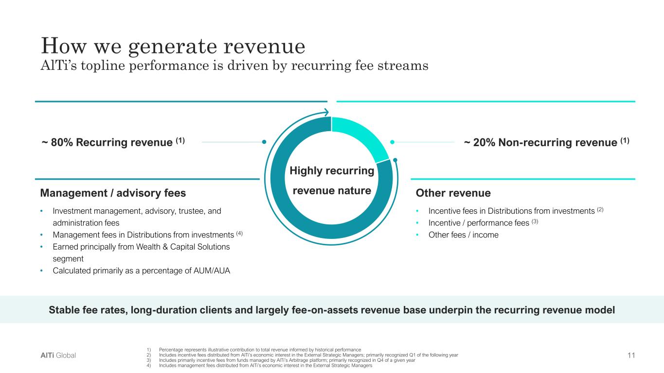 11AlTi Global How we generate revenue AlTi’s topline performance is driven by recurring fee streams ~ 80% Recurring revenue (1) ~ 20% Non-recurring revenue (1) Management / advisory fees • Investment management, advisory, trustee, and administration fees • Management fees in Distributions from investments (4) • Earned principally from Wealth & Capital Solutions segment • Calculated primarily as a percentage of AUM/AUA Other revenue • Incentive fees in Distributions from investments (2) • Incentive / performance fees (3) • Other fees / income 1) Percentage represents illustrative contribution to total revenue informed by historical performance 2) Includes incentive fees distributed from AlTi’s economic interest in the External Strategic Managers; primarily recognized Q1 of the following year 3) Includes primarily incentive fees from funds managed by AlTi’s Arbitrage platform; primarily recognized in Q4 of a given year 4) Includes management fees distributed from AlTi’s economic interest in the External Strategic Managers Stable fee rates, long-duration clients and largely fee-on-assets revenue base underpin the recurring revenue model Highly recurring revenue nature