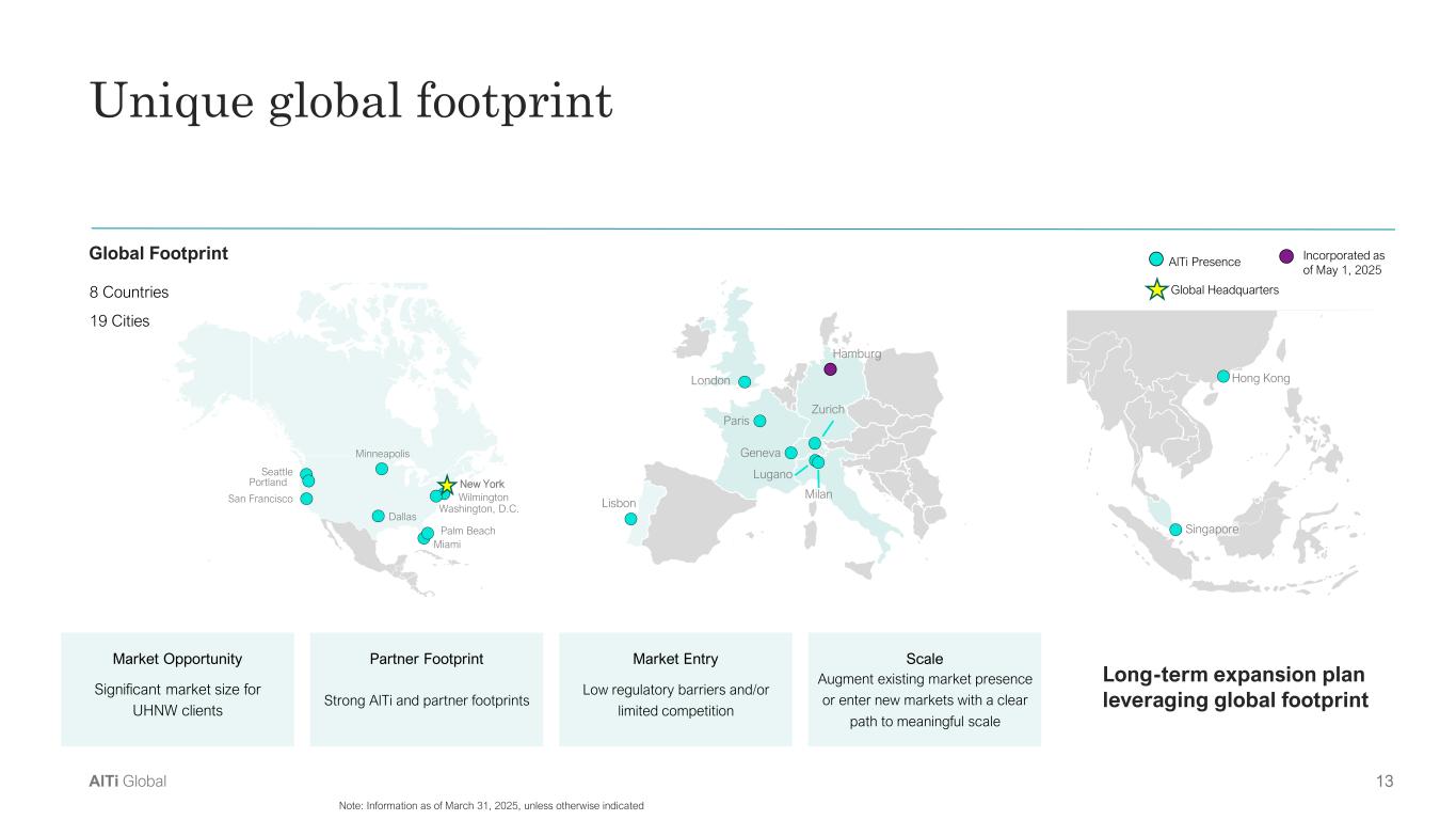 12AlTi Global Note: Illustrative only; denotes general characteristics in each category Differentiated, comprehensive, and independent platform Well-positioned to meet and exceed the diverse needs of an expanding client base Boutique Multi-Family Offices Independent Wealth Managers End-market focus Platform approach HNW / UHNW expertise Tailored solutions Global Banks Size and scale International presence Independent, Integrated and International
