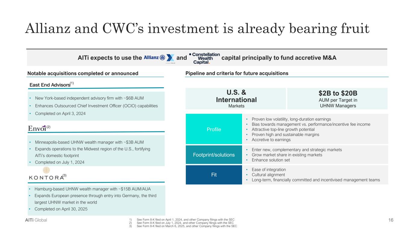 15AlTi Global Strategic investments provide capital, access and relationships Global financial services provider across the insurance and asset management sectors, providing financial security and certainty to its customers for 130+ years. CWC provides flexible, long-term capital solutions and strategic advisory support to scaled wealth management platforms, leveraging its deep industry experience and relationships. AlTi announced strategic investment of up to $450M from our partners, Allianz X and CWC Fund M&A pipeline for compelling inorganic growth opportunities1 benefits from the strategic investment Accelerate international growth and expand global footprint2 Execute upon organic growth and efficiency initiatives3 Strategic partnerships with deeply experienced partners4