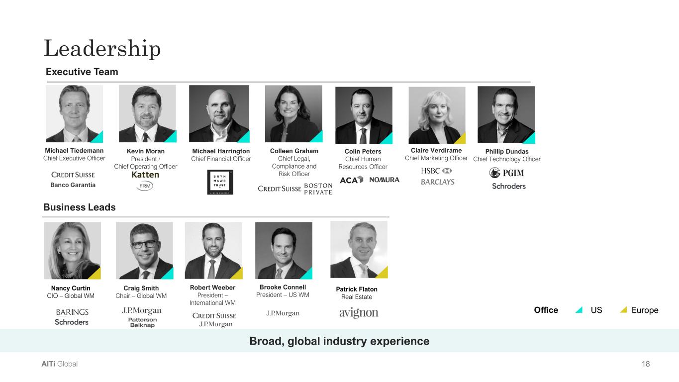 18AlTi Global Business Leads Broad, global industry experience Leadership Michael Tiedemann Chief Executive Officer Kevin Moran President / Chief Operating Officer Michael Harrington Chief Financial Officer Colleen Graham Chief Legal, Compliance and Risk Officer Claire Verdirame Chief Marketing Officer Executive Team US Europe Nancy Curtin CIO – Global WM Brooke Connell President – US WM Craig Smith Chair – Global WM Robert Weeber President – International WM Patrick Flaton Real Estate Office Colin Peters Chief Human Resources Officer Phillip Dundas Chief Technology Officer