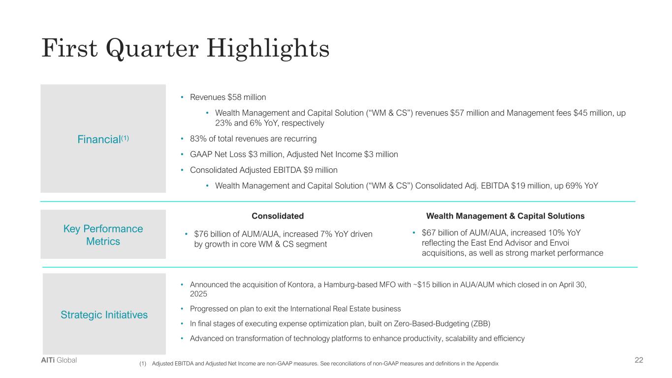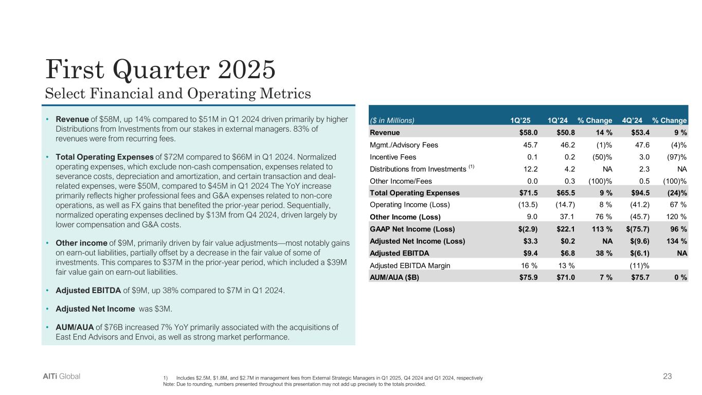 22AlTi Global Financial(1) Key Performance Metrics • Revenues $58 million • Wealth Management and Capital Solution (“WM & CS”) revenues $57 million and Management fees $45 million, up 23% and 6% YoY, respectively • 83% of total revenues are recurring • GAAP Net Loss $3 million, Adjusted Net Income $3 million • Consolidated Adjusted EBITDA $9 million • Wealth Management and Capital Solution (“WM & CS”) Consolidated Adj. EBITDA $19 million, up 69% YoY First Quarter Highlights • $76 billion of AUM/AUA, increased 7% YoY driven by growth in core WM & CS segment Consolidated Wealth Management & Capital Solutions (1) Adjusted EBITDA and Adjusted Net Income are non-GAAP measures. See reconciliations of non-GAAP measures and definitions in the Appendix • $67 billion of AUM/AUA, increased 10% YoY reflecting the East End Advisor and Envoi acquisitions, as well as strong market performance Strategic Initiatives • Announced the acquisition of Kontora, a Hamburg-based MFO with ~$15 billion in AUA/AUM which closed in on April 30, 2025 • Progressed on plan to exit the International Real Estate business • In final stages of executing expense optimization plan, built on Zero-Based-Budgeting (ZBB) • Advanced on transformation of technology platforms to enhance productivity, scalability and efficiency