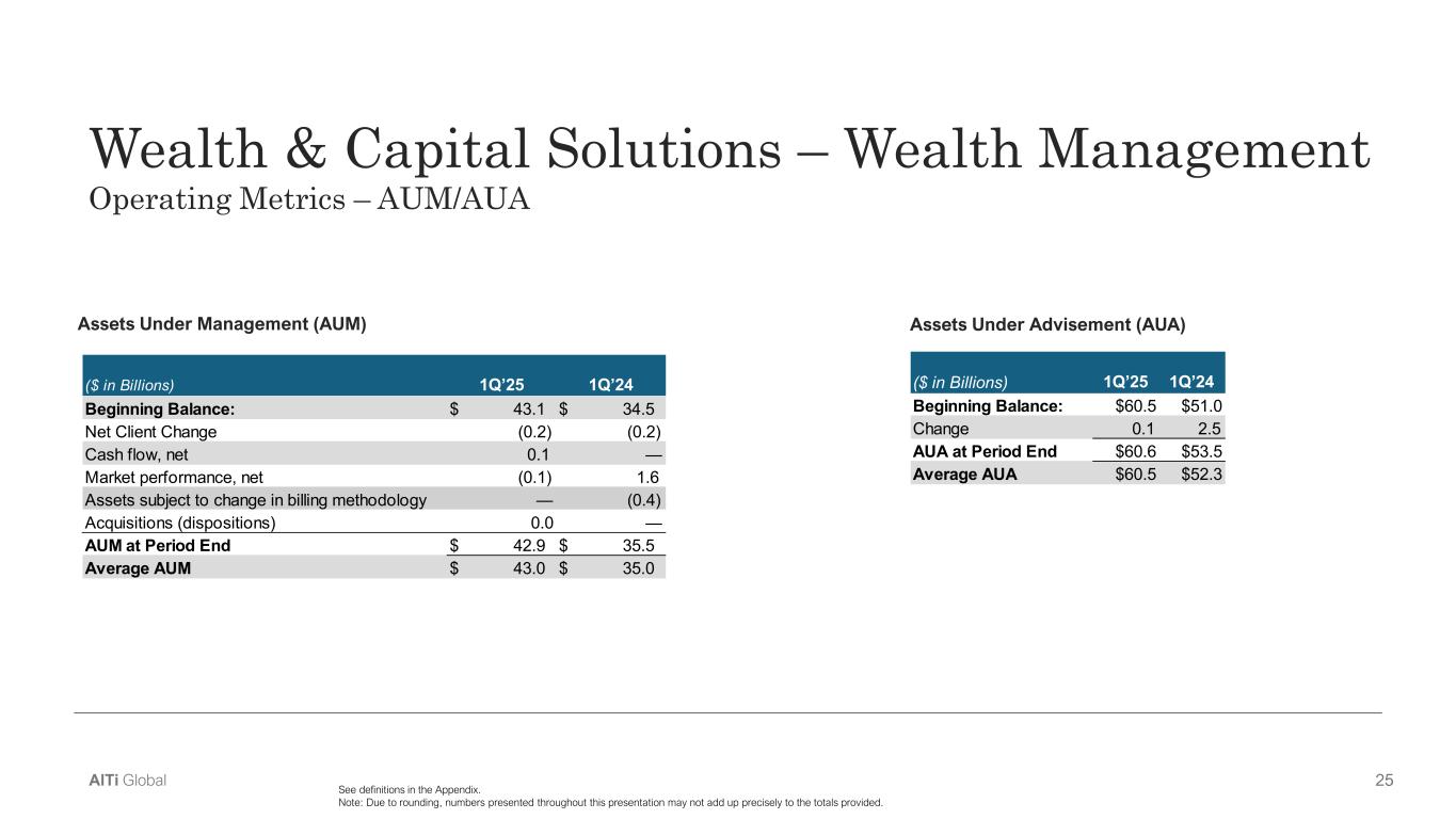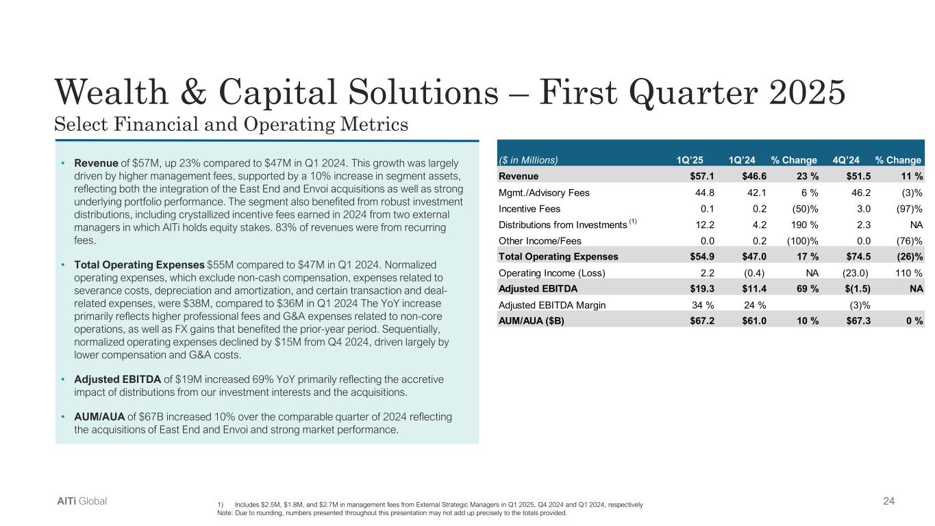 24AlTi Global • Revenue of $57M, up 23% compared to $47M in Q1 2024. This growth was largely driven by higher management fees, supported by a 10% increase in segment assets, reflecting both the integration of the East End and Envoi acquisitions as well as strong underlying portfolio performance. The segment also benefited from robust investment distributions, including crystallized incentive fees earned in 2024 from two external managers in which AlTi holds equity stakes. 83% of revenues were from recurring fees. • Total Operating Expenses $55M compared to $47M in Q1 2024. Normalized operating expenses, which exclude non-cash compensation, expenses related to severance costs, depreciation and amortization, and certain transaction and deal- related expenses, were $38M, compared to $36M in Q1 2024 The YoY increase primarily reflects higher professional fees and G&A expenses related to non-core operations, as well as FX gains that benefited the prior-year period. Sequentially, normalized operating expenses declined by $15M from Q4 2024, driven largely by lower compensation and G&A costs. • Adjusted EBITDA of $19M increased 69% YoY primarily reflecting the accretive impact of distributions from our investment interests and the acquisitions. • AUM/AUA of $67B increased 10% over the comparable quarter of 2024 reflecting the acquisitions of East End and Envoi and strong market performance. Wealth & Capital Solutions – First Quarter 2025 Select Financial and Operating Metrics 1) Includes $2.5M, $1.8M, and $2.7M in management fees from External Strategic Managers in Q1 2025, Q4 2024 and Q1 2024, respectively Note: Due to rounding, numbers presented throughout this presentation may not add up precisely to the totals provided. ($ in Millions) 1Q’25 1Q’24 % Change 4Q’24 % Change Revenue $57.1 $46.6 23 % $51.5 11 % Mgmt./Advisory Fees 44.8 42.1 6 % 46.2 (3)% Incentive Fees 0.1 0.2 (50)% 3.0 (97)% Distributions from Investments (1) 12.2 4.2 190 % 2.3 NA Other Income/Fees 0.0 0.2 (100)% 0.0 (76)% Total Operating Expenses $54.9 $47.0 17 % $74.5 (26)% Operating Income (Loss) 2.2 (0.4) NA (23.0) 110 % Adjusted EBITDA $19.3 $11.4 69 % $(1.5) NA Adjusted EBITDA Margin 34 % 24 % (3)% AUM/AUA ($B) $67.2 $61.0 10 % $67.3 0 %