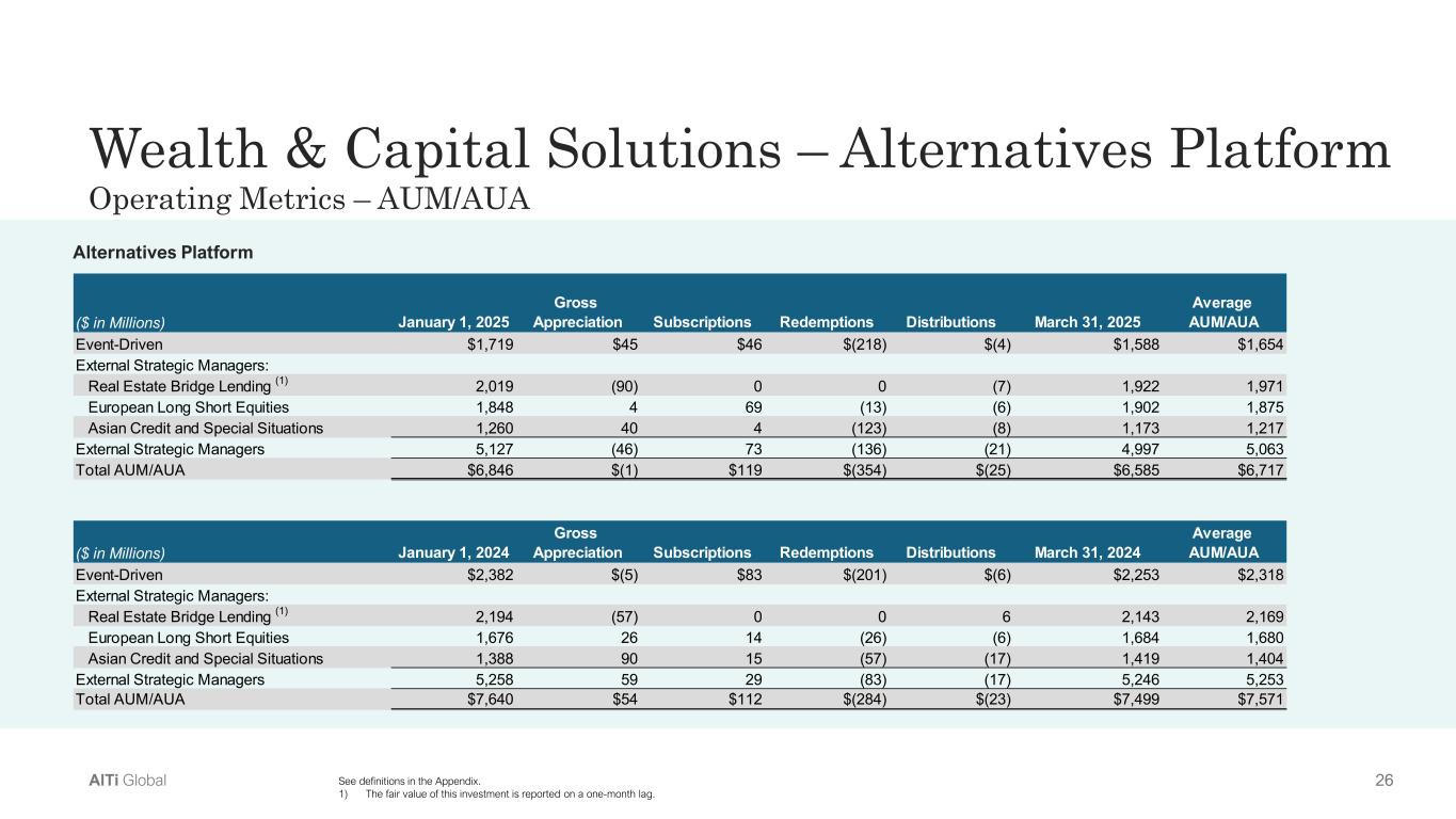 25AlTi Global Wealth & Capital Solutions – Wealth Management Operating Metrics – AUM/AUA Assets Under Management (AUM) See definitions in the Appendix. Note: Due to rounding, numbers presented throughout this presentation may not add up precisely to the totals provided. Assets Under Advisement (AUA) ($ in Billions) 1Q’25 1Q’24 Beginning Balance: $60.5 $51.0 Change 0.1 2.5 AUA at Period End $60.6 $53.5 Average AUA $60.5 $52.3 ($ in Billions) 1Q’25 1Q’24 Beginning Balance: $ 43.1 $ 34.5 Net Client Change (0.2) (0.2) Cash flow, net 0.1 — Market performance, net (0.1) 1.6 Assets subject to change in billing methodology — (0.4) Acquisitions (dispositions) 0.0 — AUM at Period End $ 42.9 $ 35.5 Average AUM $ 43.0 $ 35.0