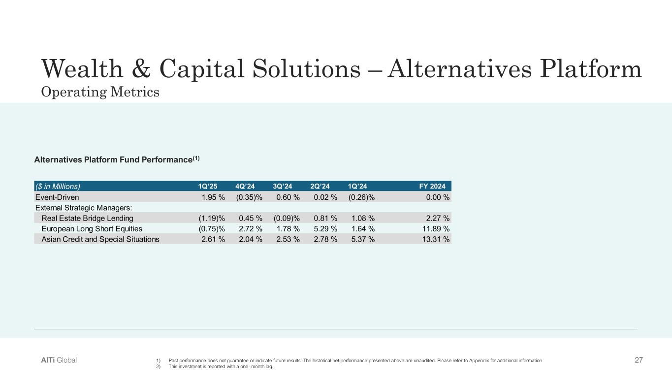 26AlTi Global Wealth & Capital Solutions – Alternatives Platform Operating Metrics – AUM/AUA Alternatives Platform See definitions in the Appendix. 1) The fair value of this investment is reported on a one-month lag. ($ in Millions) January 1, 2025 Gross Appreciation Subscriptions Redemptions Distributions March 31, 2025 Average AUM/AUA Event-Driven $1,719 $45 $46 $(218) $(4) $1,588 $1,654 External Strategic Managers: Real Estate Bridge Lending (1) 2,019 (90) 0 0 (7) 1,922 1,971 European Long Short Equities 1,848 4 69 (13) (6) 1,902 1,875 Asian Credit and Special Situations 1,260 40 4 (123) (8) 1,173 1,217 External Strategic Managers 5,127 (46) 73 (136) (21) 4,997 5,063 Total AUM/AUA $6,846 $(1) $119 $(354) $(25) $6,585 $6,717 ($ in Millions) January 1, 2024 Gross Appreciation Subscriptions Redemptions Distributions March 31, 2024 Average AUM/AUA Event-Driven $2,382 $(5) $83 $(201) $(6) $2,253 $2,318 External Strategic Managers: Real Estate Bridge Lending (1) 2,194 (57) 0 0 6 2,143 2,169 European Long Short Equities 1,676 26 14 (26) (6) 1,684 1,680 Asian Credit and Special Situations 1,388 90 15 (57) (17) 1,419 1,404 External Strategic Managers 5,258 59 29 (83) (17) 5,246 5,253 Total AUM/AUA $7,640 $54 $112 $(284) $(23) $7,499 $7,571