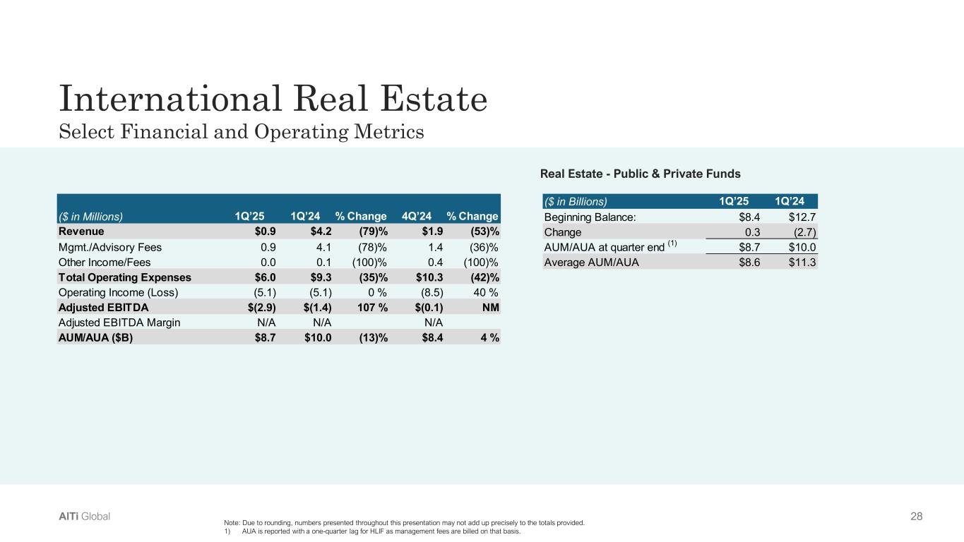 28AlTi Global International Real Estate Select Financial and Operating Metrics Real Estate - Public & Private Funds Note: Due to rounding, numbers presented throughout this presentation may not add up precisely to the totals provided. 1) AUA is reported with a one-quarter lag for HLIF as management fees are billed on that basis. ($ in Billions) 1Q’25 1Q’24 Beginning Balance: $8.4 $12.7 Change 0.3 (2.7) AUM/AUA at quarter end (1) $8.7 $10.0 Average AUM/AUA $8.6 $11.3 ($ in Millions) 1Q’25 1Q’24 % Change 4Q’24 % Change Revenue $0.9 $4.2 (79)% $1.9 (53)% Mgmt./Advisory Fees 0.9 4.1 (78)% 1.4 (36)% Other Income/Fees 0.0 0.1 (100)% 0.4 (100)% Total Operating Expenses $6.0 $9.3 (35)% $10.3 (42)% Operating Income (Loss) (5.1) (5.1) 0 % (8.5) 40 % Adjusted EBITDA $(2.9) $(1.4) 107 % $(0.1) NM Adjusted EBITDA Margin N/A N/A N/A AUM/AUA ($B) $8.7 $10.0 (13)% $8.4 4 %