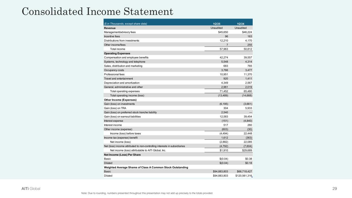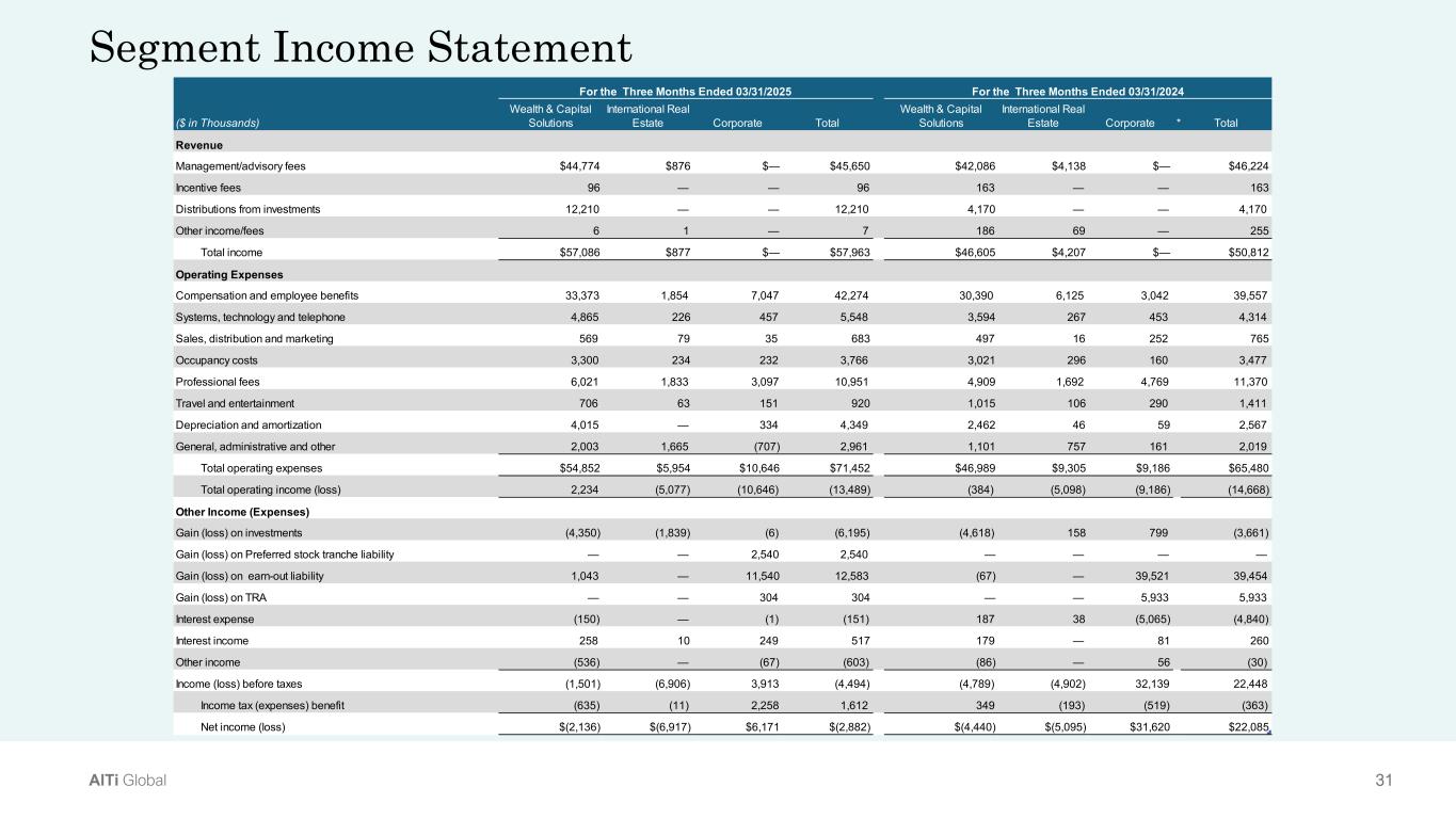 31AlTi Global Segment Income Statement ($ in Thousands) Wealth & Capital Solutions International Real Estate Corporate Total Wealth & Capital Solutions International Real Estate Corporate * Total Revenue Management/advisory fees $44,774 $876 $— $45,650 $42,086 $4,138 $— $46,224 Incentive fees 96 — — 96 163 — — 163 Distributions from investments 12,210 — — 12,210 4,170 — — 4,170 Other income/fees 6 1 — 7 186 69 — 255 Total income $57,086 $877 $— $57,963 $46,605 $4,207 $— $50,812 Operating Expenses Compensation and employee benefits 33,373 1,854 7,047 42,274 30,390 6,125 3,042 39,557 Systems, technology and telephone 4,865 226 457 5,548 3,594 267 453 4,314 Sales, distribution and marketing 569 79 35 683 497 16 252 765 Occupancy costs 3,300 234 232 3,766 3,021 296 160 3,477 Professional fees 6,021 1,833 3,097 10,951 4,909 1,692 4,769 11,370 Travel and entertainment 706 63 151 920 1,015 106 290 1,411 Depreciation and amortization 4,015 — 334 4,349 2,462 46 59 2,567 General, administrative and other 2,003 1,665 (707) 2,961 1,101 757 161 2,019 Total operating expenses $54,852 $5,954 $10,646 $71,452 $46,989 $9,305 $9,186 $65,480 Total operating income (loss) 2,234 (5,077) (10,646) (13,489) (384) (5,098) (9,186) (14,668) Other Income (Expenses) Gain (loss) on investments (4,350) (1,839) (6) (6,195) (4,618) 158 799 (3,661) Gain (loss) on Preferred stock tranche liability — — 2,540 2,540 — — — — Gain (loss) on earn-out liability 1,043 — 11,540 12,583 (67) — 39,521 39,454 Gain (loss) on TRA — — 304 304 — — 5,933 5,933 Interest expense (150) — (1) (151) 187 38 (5,065) (4,840) Interest income 258 10 249 517 179 — 81 260 Other income (536) — (67) (603) (86) — 56 (30) Income (loss) before taxes (1,501) (6,906) 3,913 (4,494) (4,789) (4,902) 32,139 22,448 Income tax (expenses) benefit (635) (11) 2,258 1,612 349 (193) (519) (363) Net income (loss) $(2,136) $(6,917) $6,171 $(2,882) $(4,440) $(5,095) $31,620 $22,085 For the Three Months Ended 03/31/2025 For the Three Months Ended 03/31/2024