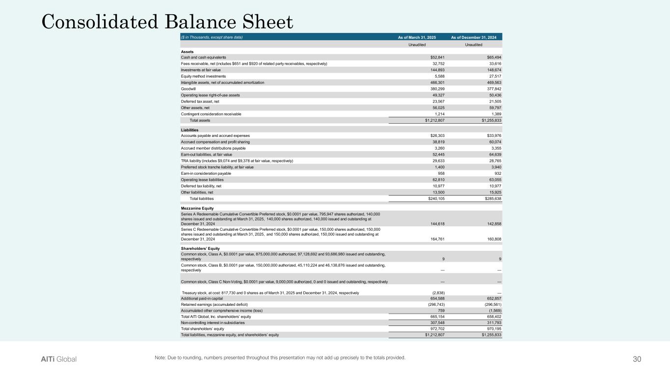 29AlTi Global Consolidated Income Statement Note: Due to rounding, numbers presented throughout this presentation may not add up precisely to the totals provided. ($ in Thousands, except share data) 1Q’25 1Q’24 Revenue Unaudited Unaudited Management/advisory fees $45,650 $46,224 Incentive fees 96 163 Distributions from investments 12,210 4,170 Other income/fees 7 255 Total income 57,963 50,812 Operating Expenses Compensation and employee benefits 42,274 39,557 Systems, technology and telephone 5,548 4,314 Sales, distribution and marketing 683 765 Occupancy costs 3,766 3,477 Professional fees 10,951 11,370 Travel and entertainment 920 1,411 Depreciation and amortization 4,349 2,567 General, administrative and other 2,961 2,019 Total operating expenses 71,452 65,480 Total operating income (loss) (13,489) (14,668) Other Income (Expenses) Gain (loss) on investments (6,195) (3,661) Gain (loss) on TRA 304 5,933 Gain (loss) on preferred stock tranche liability 2,540 — Gain (loss) on earnout liabilities 12,583 39,454 Interest expense (151) (4,840) Interest income 517 260 Other income (expense) (603) (30) Income (loss) before taxes (4,494) 22,448 Income tax (expense) benefit 1,612 (363) Net income (loss) (2,882) 22,085 Net (loss) income attributed to non-controlling interests in subsidiaries (4,792) (7,604) Net income (loss) attributable to AlTi Global, Inc. $1,910 $29,689 Net Income (Loss) Per Share Basic $(0.04) $0.38 Diluted $(0.04) $0.18 Weighted Average Shares of Class A Common Stock Outstanding Basic $94,883,803 $66,718,427 Diluted $94,883,803 $120,561,316
