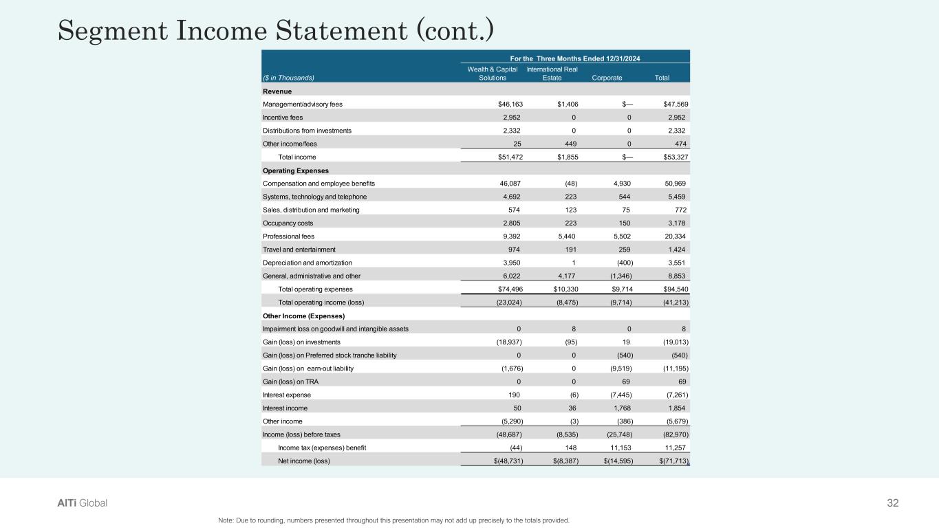 32AlTi Global Segment Income Statement (cont.) Note: Due to rounding, numbers presented throughout this presentation may not add up precisely to the totals provided. ($ in Thousands) Wealth & Capital Solutions International Real Estate Corporate Total Revenue Management/advisory fees $46,163 $1,406 $— $47,569 Incentive fees 2,952 0 0 2,952 Distributions from investments 2,332 0 0 2,332 Other income/fees 25 449 0 474 Total income $51,472 $1,855 $— $53,327 Operating Expenses Compensation and employee benefits 46,087 (48) 4,930 50,969 Systems, technology and telephone 4,692 223 544 5,459 Sales, distribution and marketing 574 123 75 772 Occupancy costs 2,805 223 150 3,178 Professional fees 9,392 5,440 5,502 20,334 Travel and entertainment 974 191 259 1,424 Depreciation and amortization 3,950 1 (400) 3,551 General, administrative and other 6,022 4,177 (1,346) 8,853 Total operating expenses $74,496 $10,330 $9,714 $94,540 Total operating income (loss) (23,024) (8,475) (9,714) (41,213) Other Income (Expenses) Impairment loss on goodwill and intangible assets 0 8 0 8 Gain (loss) on investments (18,937) (95) 19 (19,013) Gain (loss) on Preferred stock tranche liability 0 0 (540) (540) Gain (loss) on earn-out liability (1,676) 0 (9,519) (11,195) Gain (loss) on TRA 0 0 69 69 Interest expense 190 (6) (7,445) (7,261) Interest income 50 36 1,768 1,854 Other income (5,290) (3) (386) (5,679) Income (loss) before taxes (48,687) (8,535) (25,748) (82,970) Income tax (expenses) benefit (44) 148 11,153 11,257 Net income (loss) $(48,731) $(8,387) $(14,595) $(71,713) For the Three Months Ended 12/31/2024