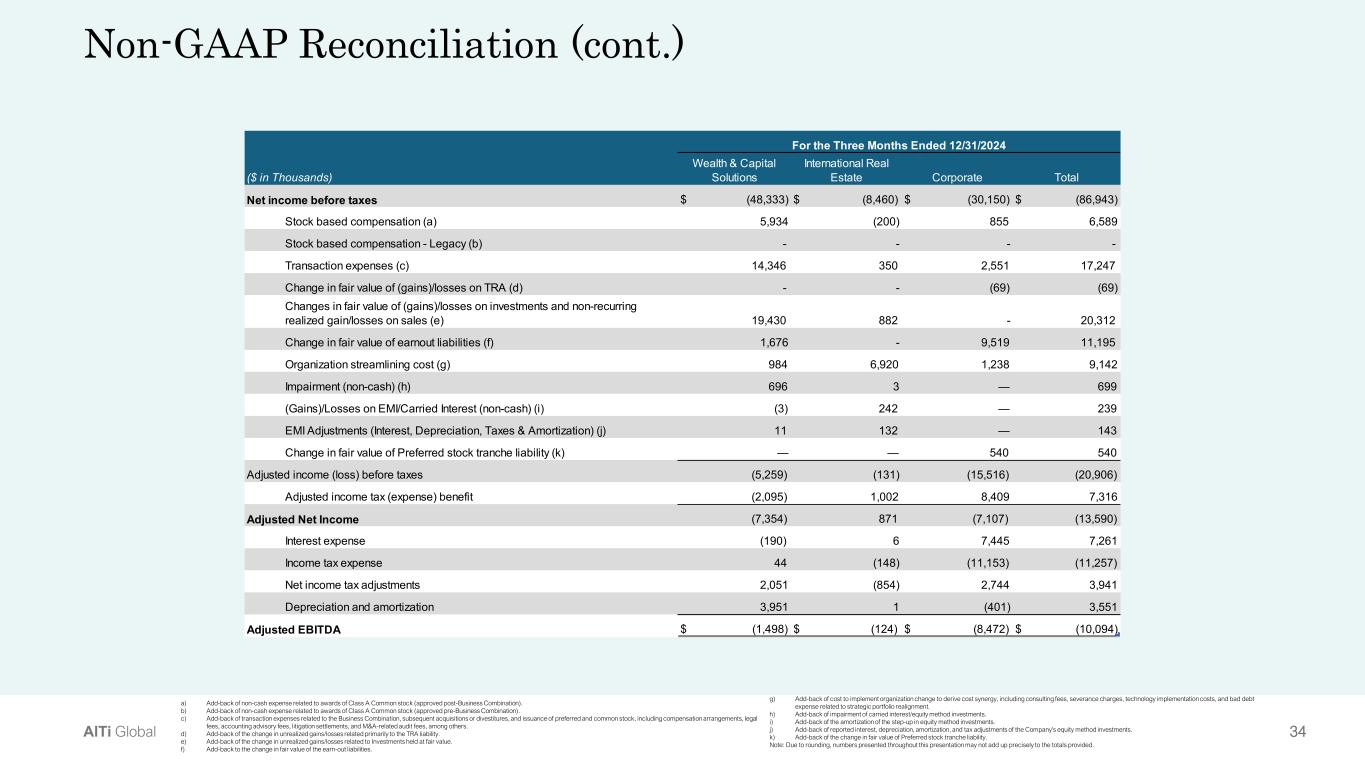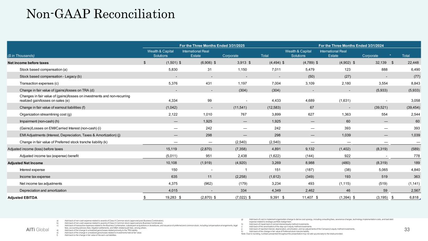 33AlTi Global g) Add-back of cost to implement organization change to derive cost synergy, including consulting fees, severance charges, technology implementation costs, and bad debt expense related to strategic portfolio realignment. h) Add-back of impairment of carried interest/equity method investments. i) Add-back of the amortization of the step-up in equity method investments. j) Add-back of reported interest, depreciation, amortization, and tax adjustments of the Company's equity method investments. k) Add-back of the change in fair value of Preferred stock tranche liability. Note: Due to rounding, numbers presented throughout this presentation may not add up precisely to the totals provided. Non-GAAP Reconciliation a) Add-back of non-cash expense related to awards of Class A Common stock (approved post-Business Combination). b) Add-back of non-cash expense related to awards of Class A Common stock (approved pre-Business Combination). c) Add-back of transaction expenses related to the Business Combination, subsequent acquisitions or divestitures, and issuance of preferred and common stock, including compensation arrangements, legal fees, accounting advisory fees, litigation settlements, and M&A-related audit fees, among others. d) Add-back of the change in unrealized gains/losses related primarily to the TRA liability. e) Add-back of the change in unrealized gains/losses related to Investments held at fair value. f) Add-back to the change in fair value of the earn-out liabilities. ($ in Thousands) Wealth & Capital Solutions International Real Estate Corporate Total Wealth & Capital Solutions International Real Estate Corporate * Total Net income before taxes $ (1,501) $ (6,906) $ 3,913 $ (4,494) $ (4,789) $ (4,902) $ 32,139 $ 22,448 Stock based compensation (a) 5,830 31 1,150 7,011 5,479 123 888 6,490 Stock based compensation - Legacy (b) - - - - (50) (27) - (77) Transaction expenses (c) 5,376 431 1,197 7,004 3,109 2,180 3,554 8,843 Change in fair value of (gains)/losses on TRA (d) - - (304) (304) - - (5,933) (5,933) Changes in fair value of (gains)/losses on investments and non-recurring realized gain/losses on sales (e) 4,334 99 - 4,433 4,689 (1,631) - 3,058 Change in fair value of earnout liabilities (f) (1,042) - (11,541) (12,583) 67 - (39,521) (39,454) Organization streamlining cost (g) 2,122 1,010 767 3,899 627 1,363 554 2,544 Impairment (non-cash) (h) — 1,925 — 1,925 — 60 — 60 (Gains)/Losses on EMI/Carried Interest (non-cash) (i) — 242 — 242 — 393 — 393 EMI Adjustments (Interest, Depreciation, Taxes & Amortization) (j) — 298 — 298 — 1,039 — 1,039 Change in fair value of Preferred stock tranche liability (k) — — (2,540) (2,540) — — — — Adjusted income (loss) before taxes 15,119 (2,870) (7,358) 4,891 9,132 (1,402) (8,319) (589) Adjusted income tax (expense) benefit (5,011) 951 2,438 (1,622) (144) 922 - 778 Adjusted Net Income 10,108 (1,919) (4,920) 3,269 8,988 (480) (8,319) 189 Interest expense 150 - 1 151 (187) (38) 5,065 4,840 Income tax expense 635 11 (2,258) (1,612) (349) 193 519 363 Net income tax adjustments 4,375 (962) (179) 3,234 493 (1,115) (519) (1,141) Depreciation and amortization 4,015 - 334 4,349 2,462 46 59 2,567 Adjusted EBITDA $ 19,283 $ (2,870) $ (7,022) $ 9,391 $ 11,407 $ (1,394) $ (3,195) $ 6,818 For the Three Months Ended 3/31/2025 For the Three Months Ended 3/31/2024