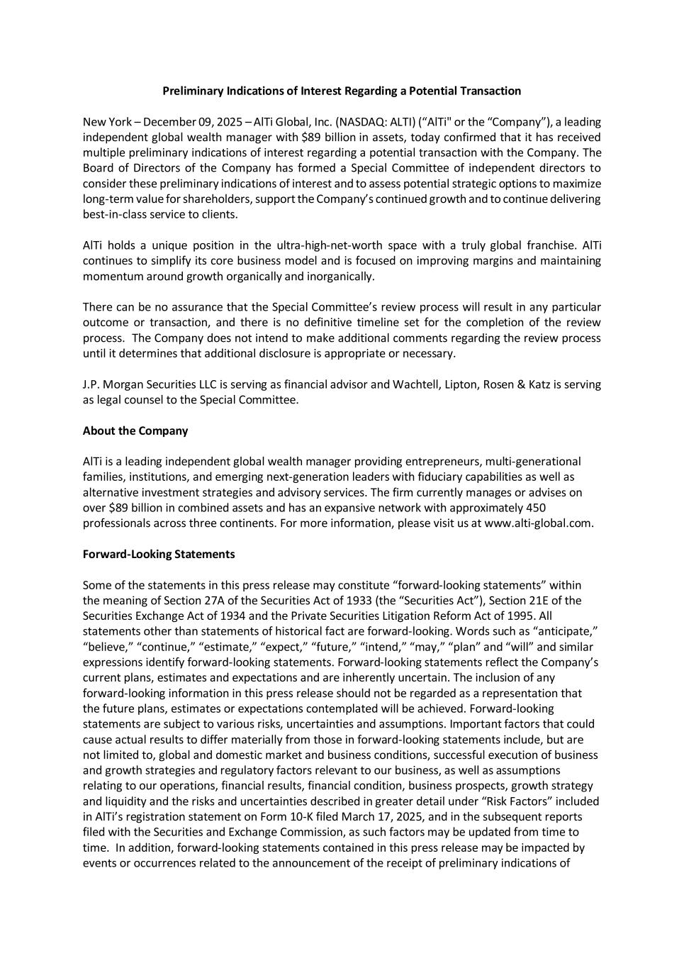 Preliminary Indications of Interest Regarding a Potential Transaction New York – December 09, 2025 – AlTi Global, Inc. (NASDAQ: ALTI) (“AlTi" or the “Company”), a leading independent global wealth manager with $89 billion in assets, today confirmed that it has received multiple preliminary indications of interest regarding a potential transaction with the Company. The Board of Directors of the Company has formed a Special Committee of independent directors to consider these preliminary indications of interest and to assess potential strategic options to maximize long-term value for shareholders, support the Company’s continued growth and to continue delivering best-in-class service to clients. AlTi holds a unique position in the ultra-high-net-worth space with a truly global franchise. AlTi continues to simplify its core business model and is focused on improving margins and maintaining momentum around growth organically and inorganically. There can be no assurance that the Special Committee’s review process will result in any particular outcome or transaction, and there is no definitive timeline set for the completion of the review process. The Company does not intend to make additional comments regarding the review process until it determines that additional disclosure is appropriate or necessary. J.P. Morgan Securities LLC is serving as financial advisor and Wachtell, Lipton, Rosen & Katz is serving as legal counsel to the Special Committee. About the Company AlTi is a leading independent global wealth manager providing entrepreneurs, multi-generational families, institutions, and emerging next-generation leaders with fiduciary capabilities as well as alternative investment strategies and advisory services. The firm currently manages or advises on over $89 billion in combined assets and has an expansive network with approximately 450 professionals across three continents. For more information, please visit us at www.alti-global.com. Forward-Looking Statements Some of the statements in this press release may constitute “forward-looking statements” within the meaning of Section 27A of the Securities Act of 1933 (the “Securities Act”), Section 21E of the Securities Exchange Act of 1934 and the Private Securities Litigation Reform Act of 1995. All statements other than statements of historical fact are forward-looking. Words such as “anticipate,” “believe,” “continue,” “estimate,” “expect,” “future,” “intend,” “may,” “plan” and “will” and similar expressions identify forward-looking statements. Forward-looking statements reflect the Company’s current plans, estimates and expectations and are inherently uncertain. The inclusion of any forward-looking information in this press release should not be regarded as a representation that the future plans, estimates or expectations contemplated will be achieved. Forward-looking statements are subject to various risks, uncertainties and assumptions. Important factors that could cause actual results to differ materially from those in forward-looking statements include, but are not limited to, global and domestic market and business conditions, successful execution of business and growth strategies and regulatory factors relevant to our business, as well as assumptions relating to our operations, financial results, financial condition, business prospects, growth strategy and liquidity and the risks and uncertainties described in greater detail under “Risk Factors” included in AlTi’s registration statement on Form 10-K filed March 17, 2025, and in the subsequent reports filed with the Securities and Exchange Commission, as such factors may be updated from time to time. In addition, forward-looking statements contained in this press release may be impacted by events or occurrences related to the announcement of the receipt of preliminary indications of