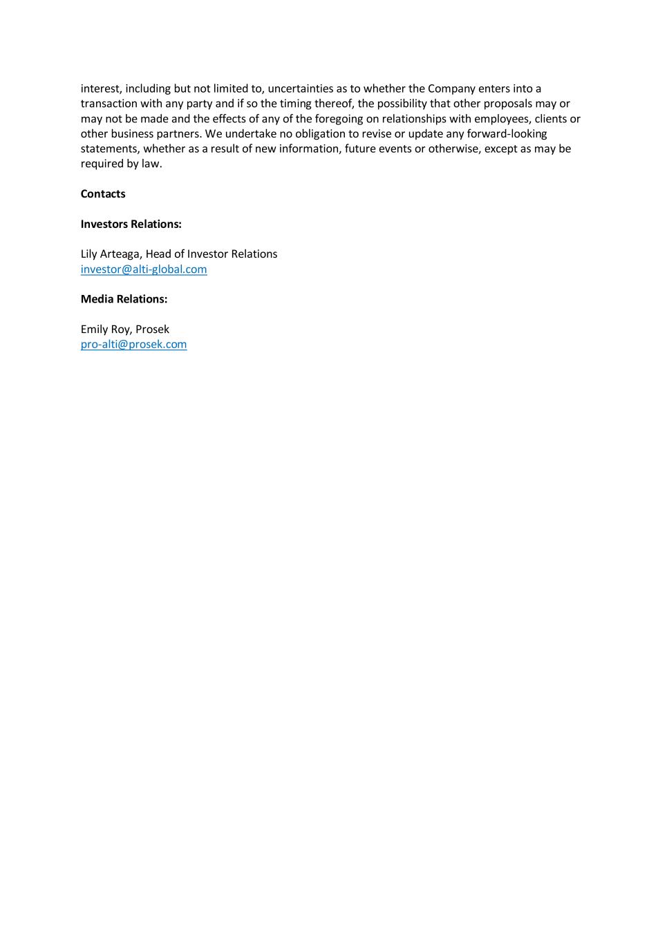 interest, including but not limited to, uncertainties as to whether the Company enters into a transaction with any party and if so the timing thereof, the possibility that other proposals may or may not be made and the effects of any of the foregoing on relationships with employees, clients or other business partners. We undertake no obligation to revise or update any forward-looking statements, whether as a result of new information, future events or otherwise, except as may be required by law. Contacts Investors Relations: Lily Arteaga, Head of Investor Relations investor@alti-global.com Media Relations: Emily Roy, Prosek pro-alti@prosek.com