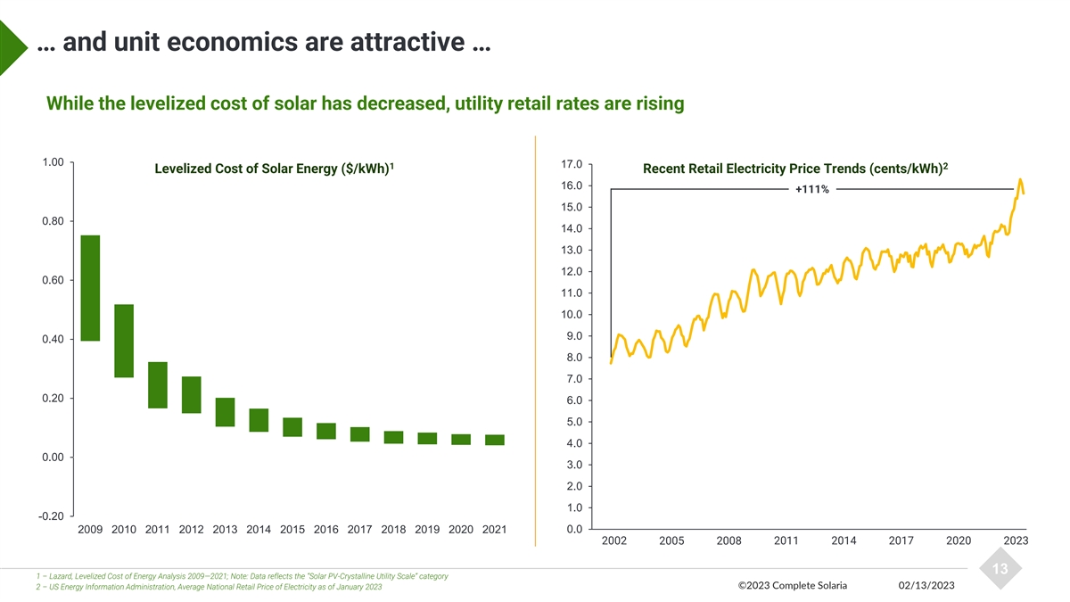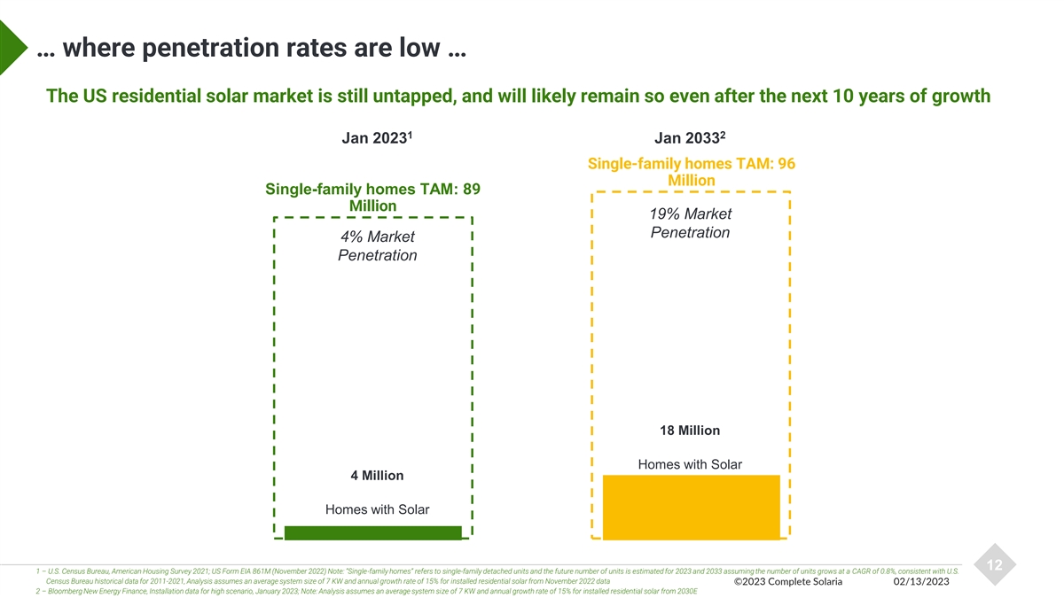… where penetration rates are low … The US residential solar market is still untapped, and will likely remain so even after the next 10 years of growth 1 2 Jan 2023 Jan 2033 Single-family homes TAM: 96 Million Single-family homes TAM: 89 Million 19% Market Penetration 4% Market Penetration 18 Million Homes with Solar 4 Million Homes with Solar 12 1 – U.S. Census Bureau, American Housing Survey 2021; US Form EIA 861M (November 2022) Note: “Single-family homes” refers to single-family detached units and the future number of units is estimated for 2023 and 2033 assuming the number of units grows at a CAGR of 0.8%, consistent with U.S. Census Bureau historical data for 2011-2021, Analysis assumes an average system size of 7 KW and annual growth rate of 15% for installed residential solar from November 2022 data ©2023 Complete Solaria 02/13/2023 2 – Bloomberg New Energy Finance, Installation data for high scenario, January 2023; Note: Analysis assumes an average system size of 7 KW and annual growth rate of 15% for installed residential solar from 2030E