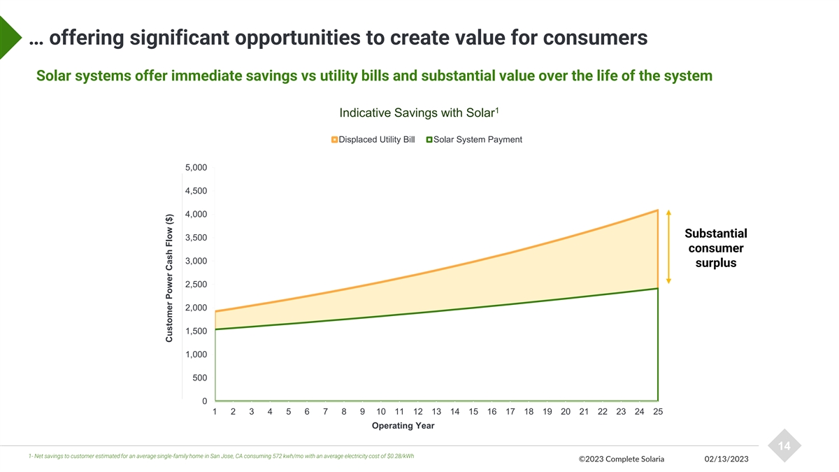 … offering significant opportunities to create value for consumers Solar systems offer immediate savings vs utility bills and substantial value over the life of the system 1 Indicative Savings with Solar Displaced Utility Bill Solar System Payment 5,000 4,500 4,000 Substantial 3,500 consumer 3,000 surplus 2,500 2,000 1,500 1,000 500 0 1 2 3 4 5 6 7 8 9 10 11 12 13 14 15 16 17 18 19 20 21 22 23 24 25 Operating Year 14 1- Net savings to customer estimated for an average single-family home in San Jose, CA consuming 572 kwh/mo with an average electricity cost of $0.28/kWh ©2023 Complete Solaria 02/13/2023 Customer Power Cash Flow ($)