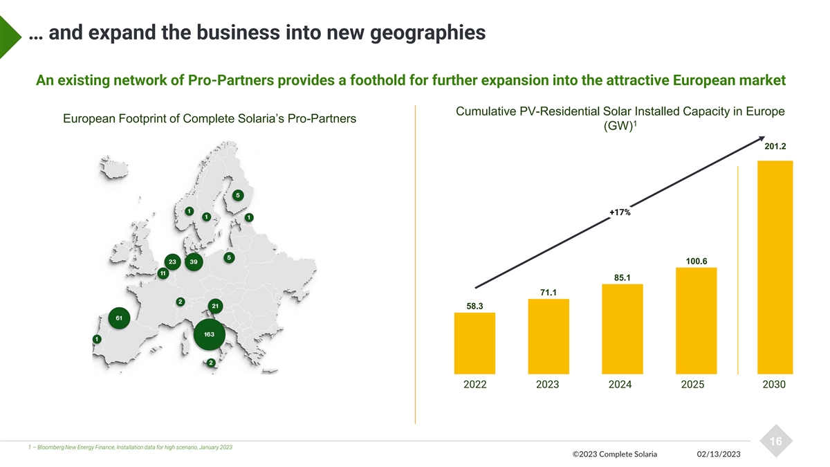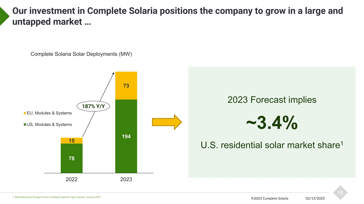 Our investment in Complete Solaria positions the company to grow in a large and untapped market … Complete Solaria Solar Deployments (MW) 73 2023 Forecast implies 187% Y/Y EU, Modules & Systems US, Modules & Systems ~3.4% 194 15 1 U.S. residential solar market share 78 2022 2023 15 1- Bloomberg New Energy Finance, Installation data for high scenario, January 2023 ©2023 Complete Solaria 02/13/2023
