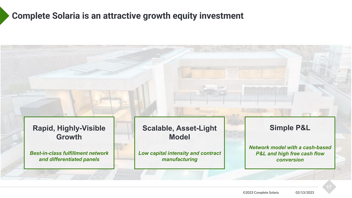 … and expand the business into new geographies An existing network of Pro-Partners provides a foothold for further expansion into the attractive European market Cumulative PV-Residential Solar Installed Capacity in Europe European Footprint of Complete Solaria’s Pro-Partners 1 (GW) 201.2 +17% 100.6 85.1 71.1 58.3 2022 2023 2024 2025 2030 16 1 – Bloomberg New Energy Finance, Installation data for high scenario, January 2023 ©2023 Complete Solaria 02/13/2023