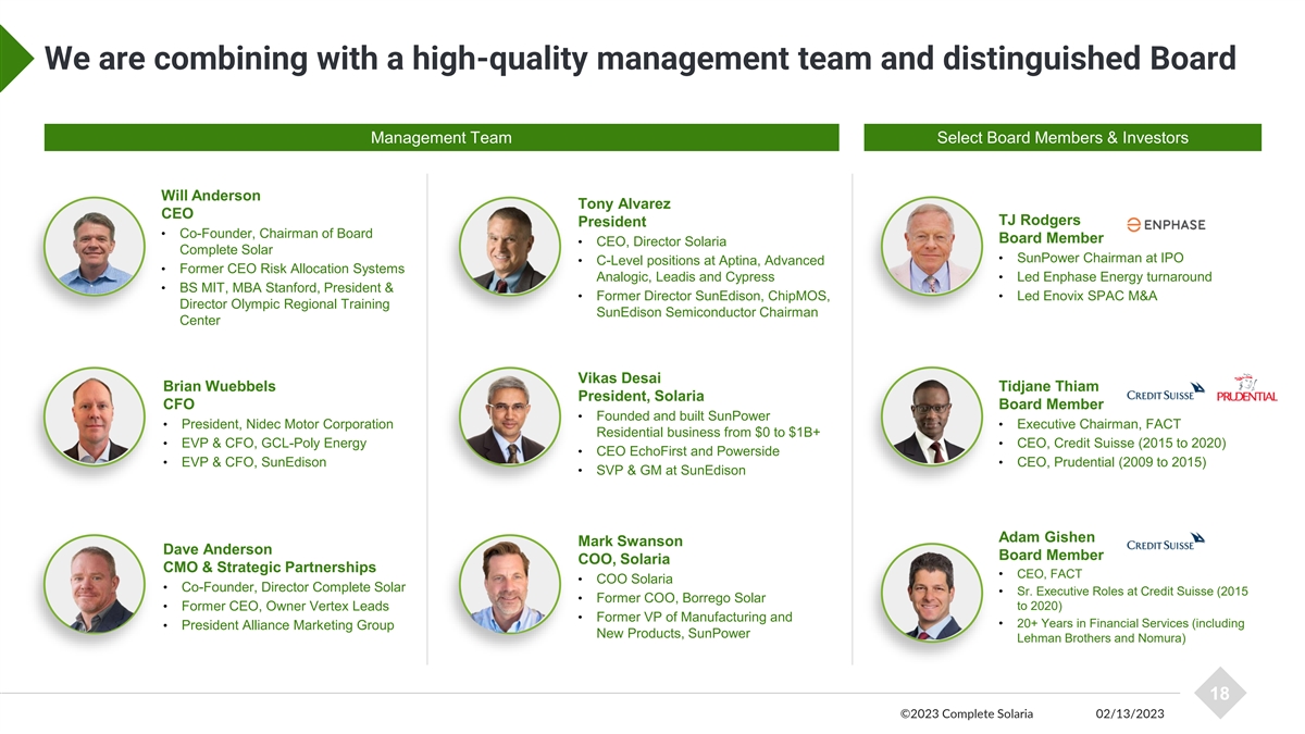 We are combining with a high-quality management team and distinguished Board Management Team Select Board Members & Investors Will Anderson Tony Alvarez CEO TJ Rodgers President • Co-Founder, Chairman of Board Board Member • CEO, Director Solaria Complete Solar • SunPower Chairman at IPO • C-Level positions at Aptina, Advanced • Former CEO Risk Allocation Systems Analogic, Leadis and Cypress • Led Enphase Energy turnaround • BS MIT, MBA Stanford, President & • Former Director SunEdison, ChipMOS, • Led Enovix SPAC M&A Director Olympic Regional Training SunEdison Semiconductor Chairman Center Vikas Desai Brian Wuebbels Tidjane Thiam President, Solaria CFO Board Member • Founded and built SunPower • President, Nidec Motor Corporation • Executive Chairman, FACT Residential business from $0 to $1B+ • EVP & CFO, GCL-Poly Energy • CEO, Credit Suisse (2015 to 2020) • CEO EchoFirst and Powerside • EVP & CFO, SunEdison • CEO, Prudential (2009 to 2015) • SVP & GM at SunEdison Adam Gishen Mark Swanson Dave Anderson Board Member COO, Solaria CMO & Strategic Partnerships • CEO, FACT • COO Solaria • Co-Founder, Director Complete Solar • Sr. Executive Roles at Credit Suisse (2015 • Former COO, Borrego Solar • Former CEO, Owner Vertex Leads to 2020) • Former VP of Manufacturing and • 20+ Years in Financial Services (including • President Alliance Marketing Group New Products, SunPower Lehman Brothers and Nomura) 18 ©2023 Complete Solaria 02/13/2023