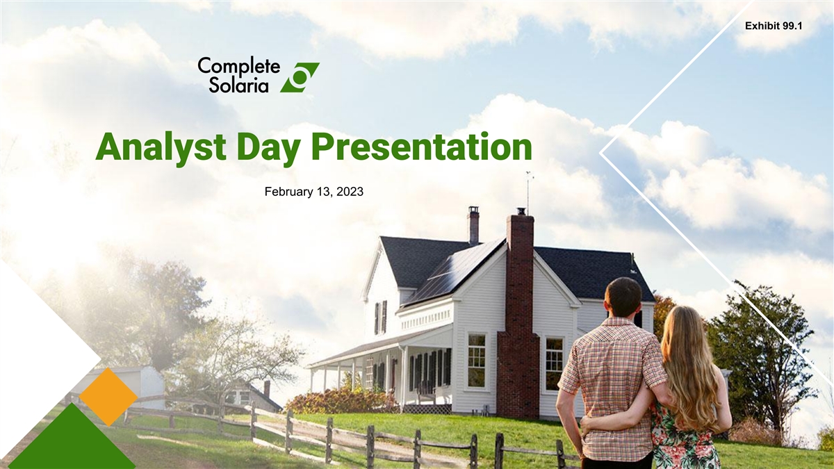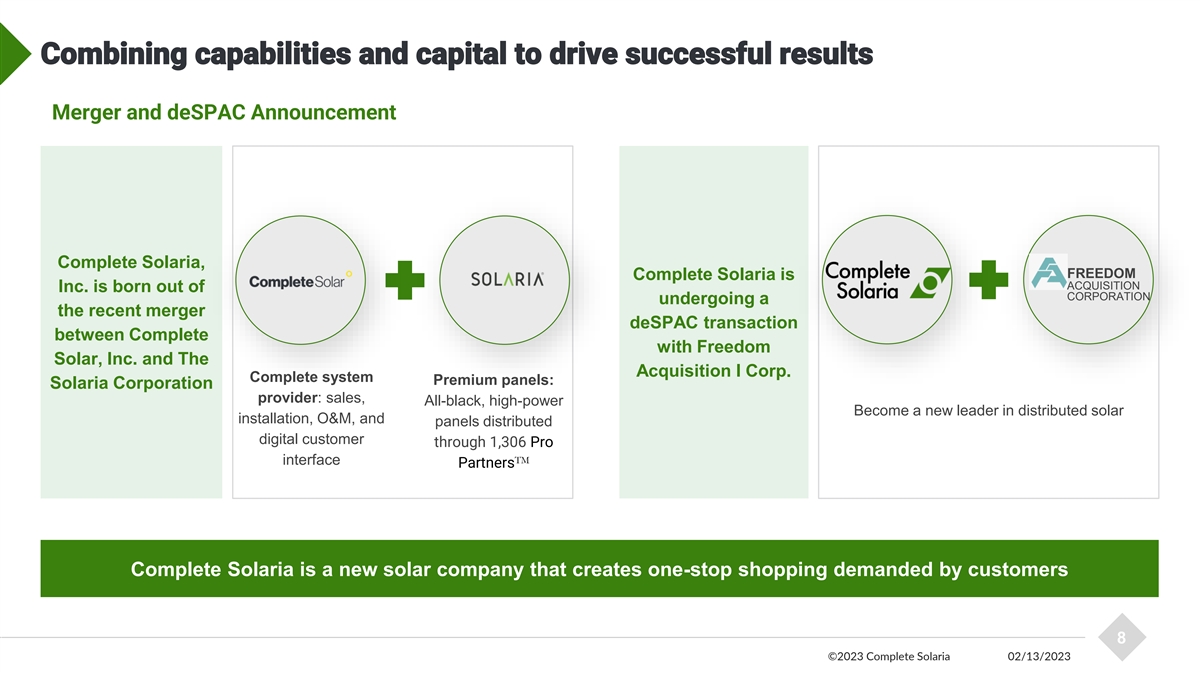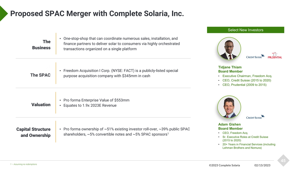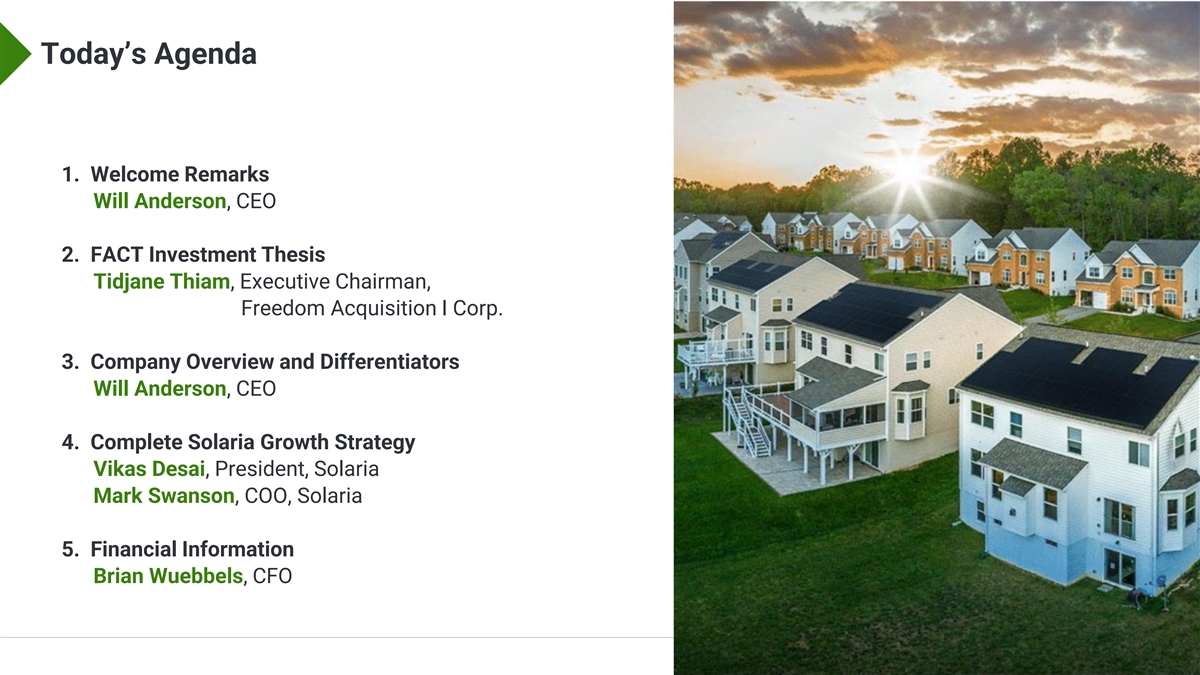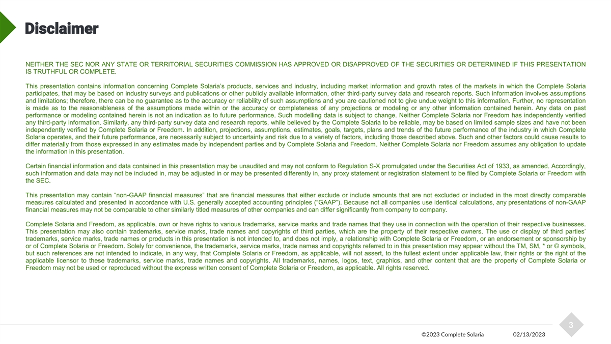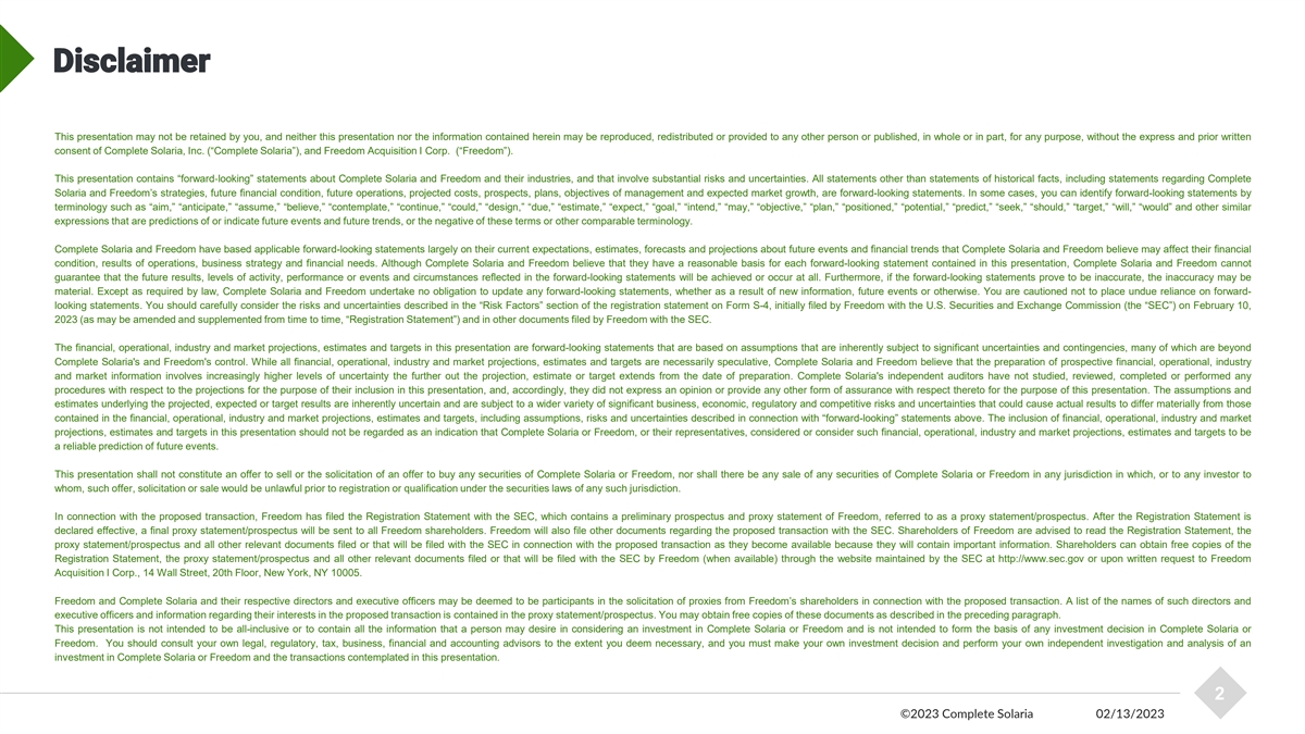 Disclaimer This presentation may not be retained by you, and neither this presentation nor the information contained herein may be reproduced, redistributed or provided to any other person or published, in whole or in part, for any purpose, without the express and prior written consent of Complete Solaria, Inc. (“Complete Solaria”), and Freedom Acquisition I Corp. (“Freedom”). This presentation contains “forward‐looking” statements about Complete Solaria and Freedom and their industries, and that involve substantial risks and uncertainties. All statements other than statements of historical facts, including statements regarding Complete Solaria and Freedom’s strategies, future financial condition, future operations, projected costs, prospects, plans, objectives of management and expected market growth, are forward-looking statements. In some cases, you can identify forward-looking statements by terminology such as “aim,” “anticipate,” “assume,” “believe,” “contemplate,” “continue,” “could,” “design,” “due,” “estimate,” “expect,” “goal,” “intend,” “may,” “objective,” “plan,” “positioned,” “potential,” “predict,” “seek,” “should,” “target,” “will,” “would” and other similar expressions that are predictions of or indicate future events and future trends, or the negative of these terms or other comparable terminology. Complete Solaria and Freedom have based applicable forward-looking statements largely on their current expectations, estimates, forecasts and projections about future events and financial trends that Complete Solaria and Freedom believe may affect their financial condition, results of operations, business strategy and financial needs. Although Complete Solaria and Freedom believe that they have a reasonable basis for each forward-looking statement contained in this presentation, Complete Solaria and Freedom cannot guarantee that the future results, levels of activity, performance or events and circumstances reflected in the forward-looking statements will be achieved or occur at all. Furthermore, if the forward-looking statements prove to be inaccurate, the inaccuracy may be material. Except as required by law, Complete Solaria and Freedom undertake no obligation to update any forward-looking statements, whether as a result of new information, future events or otherwise. You are cautioned not to place undue reliance on forward- looking statements. You should carefully consider the risks and uncertainties described in the “Risk Factors” section of the registration statement on Form S-4, initially filed by Freedom with the U.S. Securities and Exchange Commission (the “SEC”) on February 10, 2023 (as may be amended and supplemented from time to time, “Registration Statement”) and in other documents filed by Freedom with the SEC. The financial, operational, industry and market projections, estimates and targets in this presentation are forward-looking statements that are based on assumptions that are inherently subject to significant uncertainties and contingencies, many of which are beyond Complete Solaria's and Freedom's control. While all financial, operational, industry and market projections, estimates and targets are necessarily speculative, Complete Solaria and Freedom believe that the preparation of prospective financial, operational, industry and market information involves increasingly higher levels of uncertainty the further out the projection, estimate or target extends from the date of preparation. Complete Solaria's independent auditors have not studied, reviewed, completed or performed any procedures with respect to the projections for the purpose of their inclusion in this presentation, and, accordingly, they did not express an opinion or provide any other form of assurance with respect thereto for the purpose of this presentation. The assumptions and estimates underlying the projected, expected or target results are inherently uncertain and are subject to a wider variety of significant business, economic, regulatory and competitive risks and uncertainties that could cause actual results to differ materially from those contained in the financial, operational, industry and market projections, estimates and targets, including assumptions, risks and uncertainties described in connection with “forward-looking” statements above. The inclusion of financial, operational, industry and market projections, estimates and targets in this presentation should not be regarded as an indication that Complete Solaria or Freedom, or their representatives, considered or consider such financial, operational, industry and market projections, estimates and targets to be a reliable prediction of future events. This presentation shall not constitute an offer to sell or the solicitation of an offer to buy any securities of Complete Solaria or Freedom, nor shall there be any sale of any securities of Complete Solaria or Freedom in any jurisdiction in which, or to any investor to whom, such offer, solicitation or sale would be unlawful prior to registration or qualification under the securities laws of any such jurisdiction. In connection with the proposed transaction, Freedom has filed the Registration Statement with the SEC, which contains a preliminary prospectus and proxy statement of Freedom, referred to as a proxy statement/prospectus. After the Registration Statement is declared effective, a final proxy statement/prospectus will be sent to all Freedom shareholders. Freedom will also file other documents regarding the proposed transaction with the SEC. Shareholders of Freedom are advised to read the Registration Statement, the proxy statement/prospectus and all other relevant documents filed or that will be filed with the SEC in connection with the proposed transaction as they become available because they will contain important information. Shareholders can obta