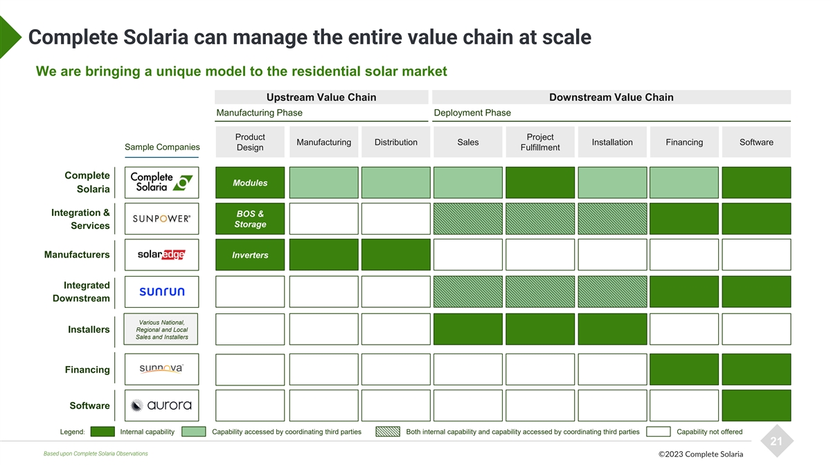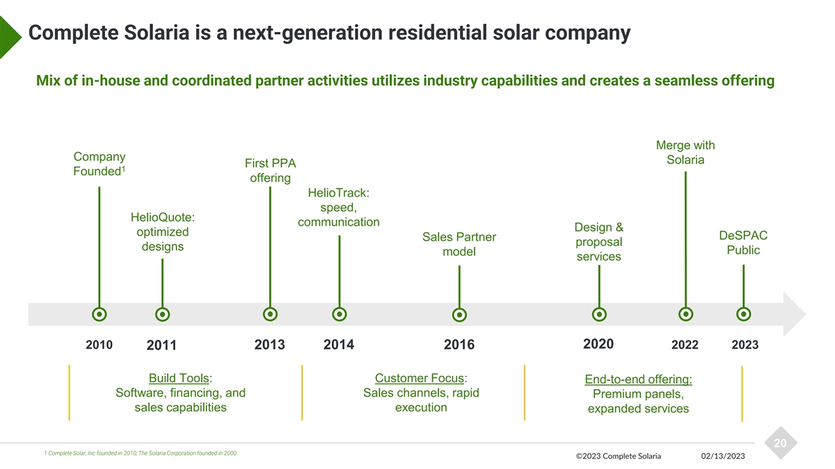 Complete Solaria is a next-generation residential solar company Mix of in-house and coordinated partner activities utilizes industry capabilities and creates a seamless offering Merge with Company Solaria First PPA 1 Founded offering HelioTrack: speed, HelioQuote: communication Design & optimized DeSPAC Sales Partner proposal designs Public model services 2020 2010 2013 2014 2016 2022 2023 2011 Build Tools: Customer Focus: End-to-end offering: Software, financing, and Sales channels, rapid Premium panels, sales capabilities execution expanded services 20 1 Complete Solar, Inc founded in 2010; The Solaria Corporation founded in 2000 ©2023 Complete Solaria 02/13/2023