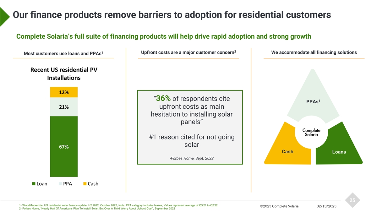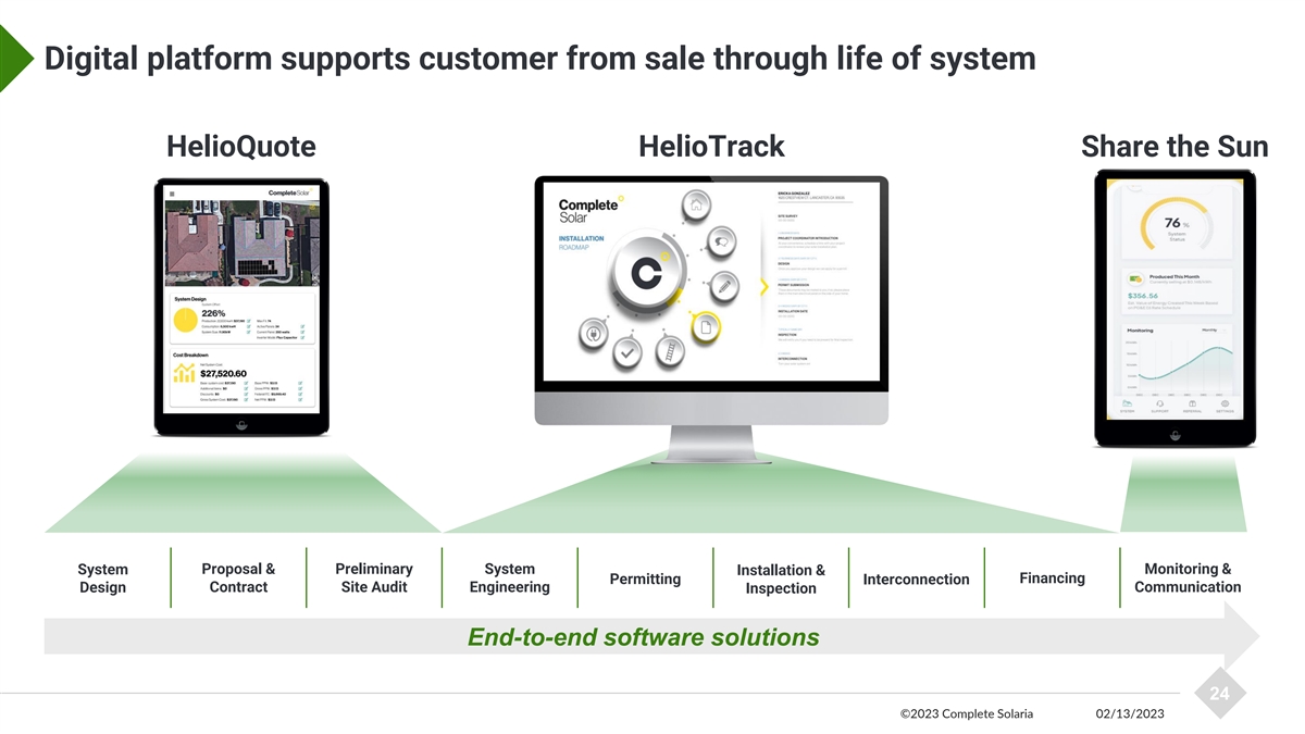Digital platform supports customer from sale through life of system HelioQuote HelioTrack Share the Sun Proposal & Preliminary System Monitoring & System Installation & Financing Permitting Interconnection Design Contract Site Audit Engineering Communication Inspection End-to-end software solutions 24 ©2023 Complete Solaria 02/13/2023