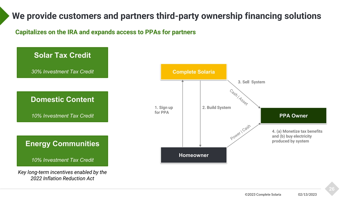Our finance products remove barriers to adoption for residential customers Complete Solaria’s full suite of financing products will help drive rapid adoption and strong growth 2 1 Upfront costs are a major customer concern We accommodate all financing solutions Most customers use loans and PPAs Recent US residential PV Installations 12% “36% of respondents cite 1 PPAs 21% upfront costs as main hesitation to installing solar panels” #1 reason cited for not going solar 67% Cash Loans -Forbes Home, Sept. 2022 Loan PPA Cash 25 1- WoodMackenzie, US residential solar finance update: H2 2022, October 2022; Note: PPA category includes leases; Values represent average of Q3’21 to Q2’22 ©2023 Complete Solaria 02/13/2023 2- Forbes Home, “Nearly Half Of Americans Plan To Install Solar, But Over A Third Worry About Upfront Cost”, September 2022