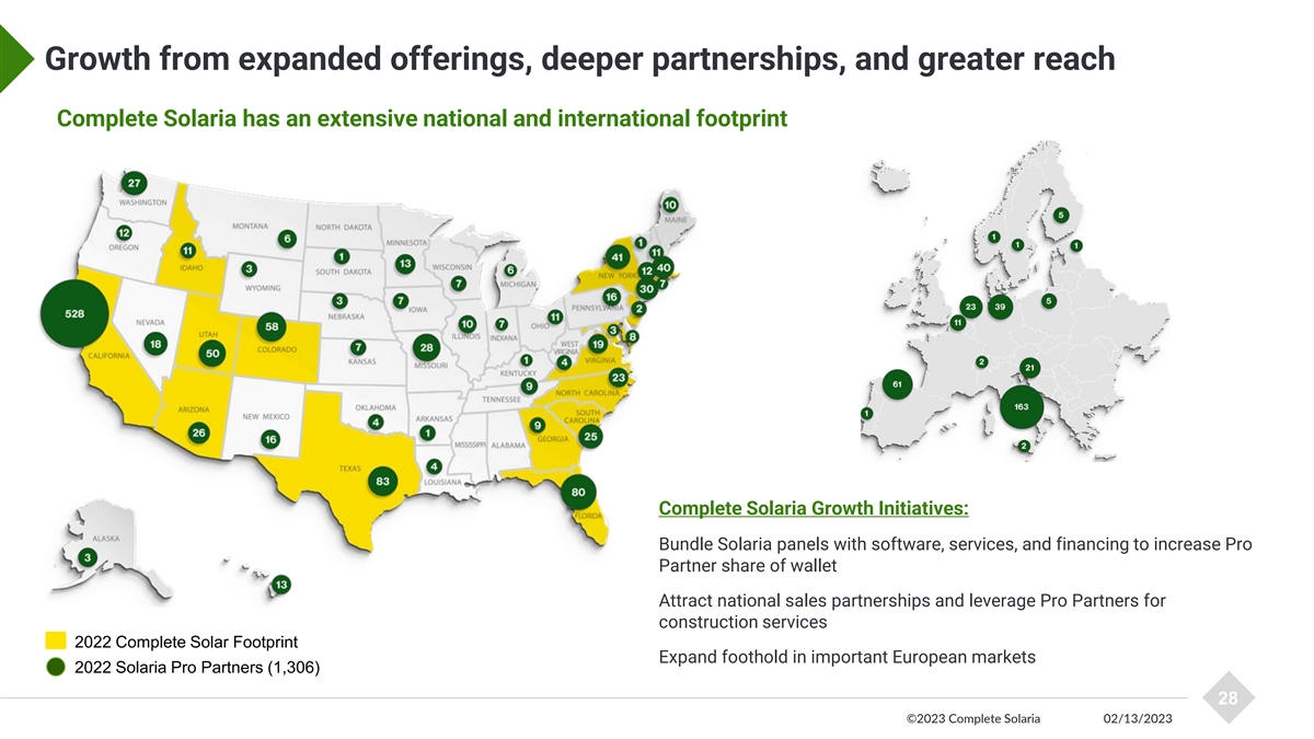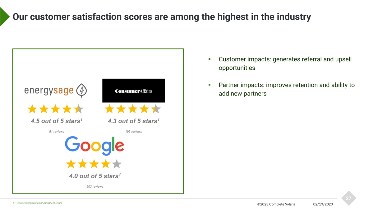 Our customer satisfaction scores are among the highest in the industry ▪ Customer impacts: generates referral and upsell opportunities ▪ Partner impacts: improves retention and ability to add new partners 1 1 4.5 out of 5 stars 4.3 out of 5 stars 51 reviews 193 reviews 1 4.0 out of 5 stars 203 reviews 27 1 – Review ratings are as of January 26, 2023 ©2023 Complete Solaria 02/13/2023