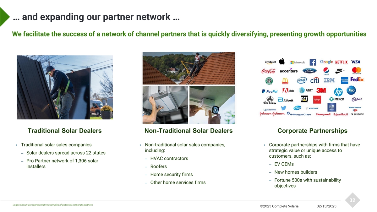 We will grow by capturing merger synergies … ▪ More efficient and effective go-to- Complete Solar Solaria market operation Product Design & Supply ▪ A better experience for our Customers and Partners Sales ▪ Bigger scale Project Development Installation Financing Workflow Automation & Specialty Software Legend: Strong capability 31 ©2023 Complete Solaria 02/13/2023