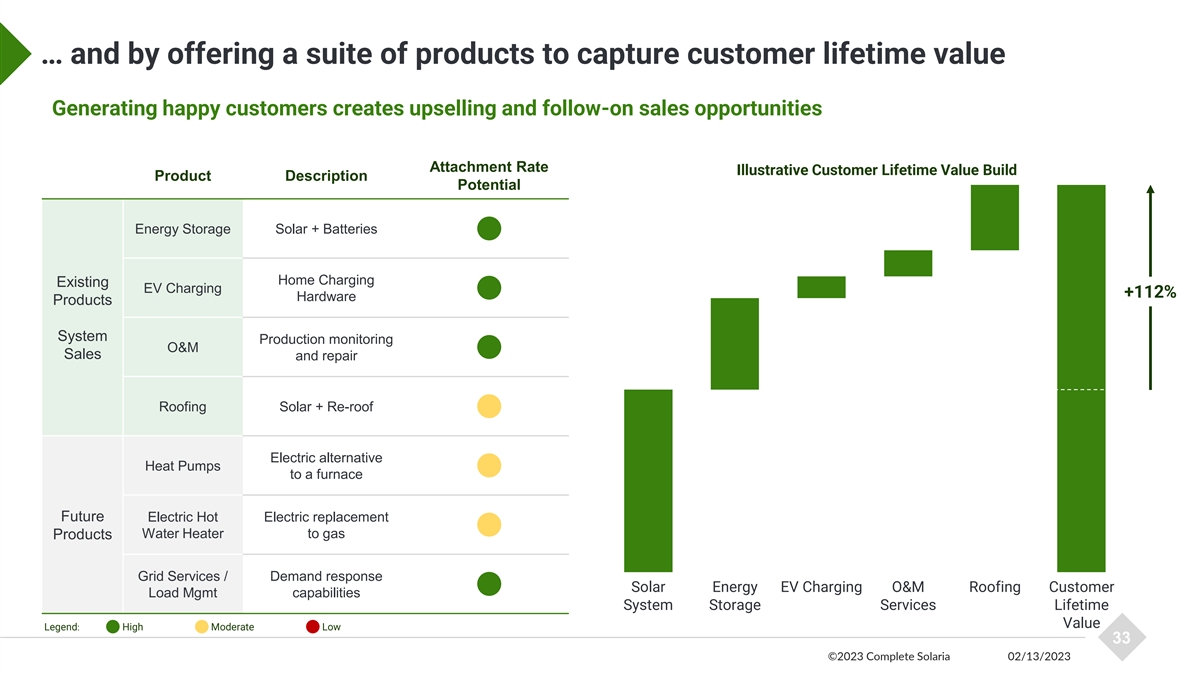 … and expanding our partner network … We facilitate the success of a network of channel partners that is quickly diversifying, presenting growth opportunities Traditional Solar Dealers Non-Traditional Solar Dealers Corporate Partnerships ▪ Traditional solar sales companies▪ Non-traditional solar sales companies, ▪ Corporate partnerships with firms that have including: strategic value or unique access to – Solar dealers spread across 22 states customers, such as: – HVAC contractors – Pro Partner network of 1,306 solar – EV OEMs installers – Roofers – New homes builders – Home security firms – Fortune 500s with sustainability – Other home services firms objectives 32 Logos shown are representative examples of potential corporate partners ©2023 Complete Solaria 02/13/2023
