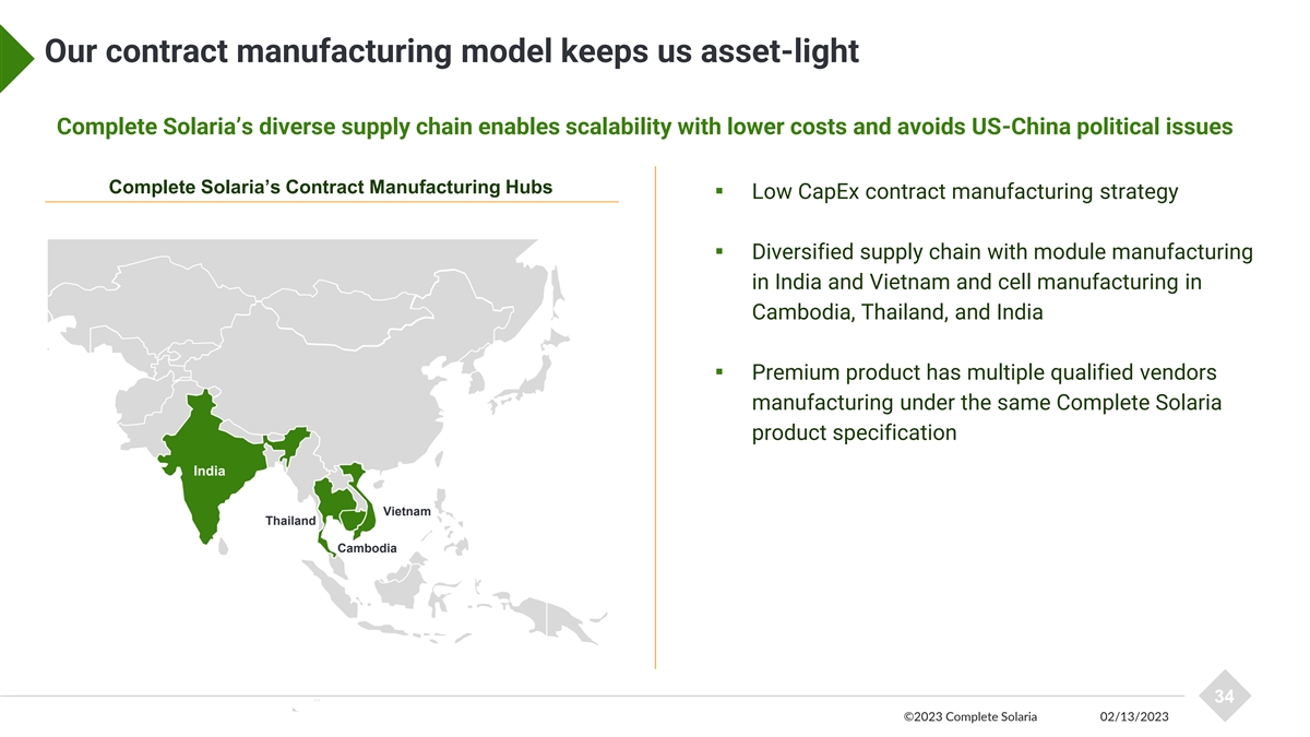 Our contract manufacturing model keeps us asset-light Complete Solaria’s diverse supply chain enables scalability with lower costs and avoids US-China political issues Complete Solaria’s Contract Manufacturing Hubs ▪ Low CapEx contract manufacturing strategy​ ▪ Diversified supply chain with module manufacturing in India and Vietnam and cell manufacturing in Cambodia, Thailand, and India​ ▪ Premium product has multiple qualified vendors manufacturing under the same Complete Solaria product specification India India Vietnam Thailand Cambodia 34 ©2023 Complete Solaria 02/13/2023