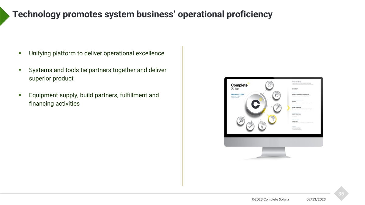 Technology promotes system business’ operational proficiency ▪ Unifying platform to deliver operational excellence ▪ Systems and tools tie partners together and deliver superior product ▪ Equipment supply, build partners, fulfillment and financing activities 35 ©2023 Complete Solaria 02/13/2023