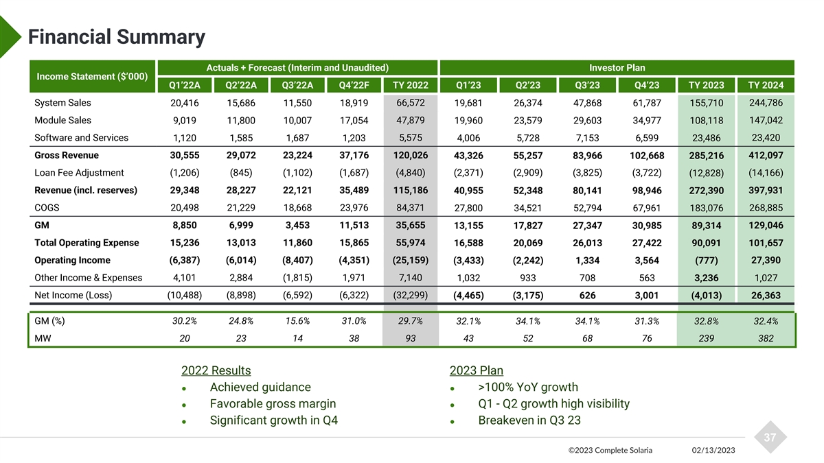 Financial Summary Actuals + Forecast (Interim and Unaudited) Investor Plan Income Statement ($’000) Q1’22A Q2’22A Q3’22A Q4’22F TY 2022 Q1’23 Q2’23 Q3’23 Q4’23 TY 2023 TY 2024 System Sales 20,416 15,686 11,550 18,919 66,572 19,681 26,374 47,868 61,787 155,710 244,786 Module Sales 9,019 11,800 10,007 17,054 47,879 19,960 23,579 29,603 34,977 108,118 147,042 Software and Services 1,120 1,585 1,687 1,203 5,575 4,006 5,728 7,153 6,599 23,486 23,420 Gross Revenue 30,555 29,072 23,224 37,176 120,026 43,326 55,257 83,966 102,668 285,216 412,097 Loan Fee Adjustment (1,206) (845) (1,102) (1,687) (4,840) (2,371) (2,909) (3,825) (3,722) (14,166) (12,828) Revenue (incl. reserves) 29,348 28,227 22,121 35,489 115,186 40,955 52,348 80,141 98,946 272,390 397,931 COGS 20,498 21,229 18,668 23,976 84,371 268,885 27,800 34,521 52,794 67,961 183,076 GM 8,850 6,999 3,453 11,513 35,655 13,155 17,827 27,347 30,985 89,314 129,046 Total Operating Expense 15,236 13,013 11,860 15,865 55,974 16,588 20,069 26,013 27,422 90,091 101,657 Operating Income (6,387) (6,014) (8,407) (4,351) (25,159) 27,390 (3,433) (2,242) 1,334 3,564 (777) Other Income & Expenses 4,101 2,884 (1,815) 1,971 7,140 1,032 933 708 563 3,236 1,027 Net Income (Loss) (10,488) (8,898) (6,592) (6,322) (32,299) (4,465) (3,175) 626 3,001 (4,013) 26,363 GM (%) 30.2% 24.8% 15.6% 31.0% 29.7% 32.1% 34.1% 34.1% 31.3% 32.8% 32.4% MW 20 23 14 38 93 43 52 68 76 239 382 2022 Results 2023 Plan ● Achieved guidance ● >100% YoY growth ● Favorable gross margin ● Q1 - Q2 growth high visibility ● Significant growth in Q4 ● Breakeven in Q3 23 37 ©2023 Complete Solaria 02/13/2023