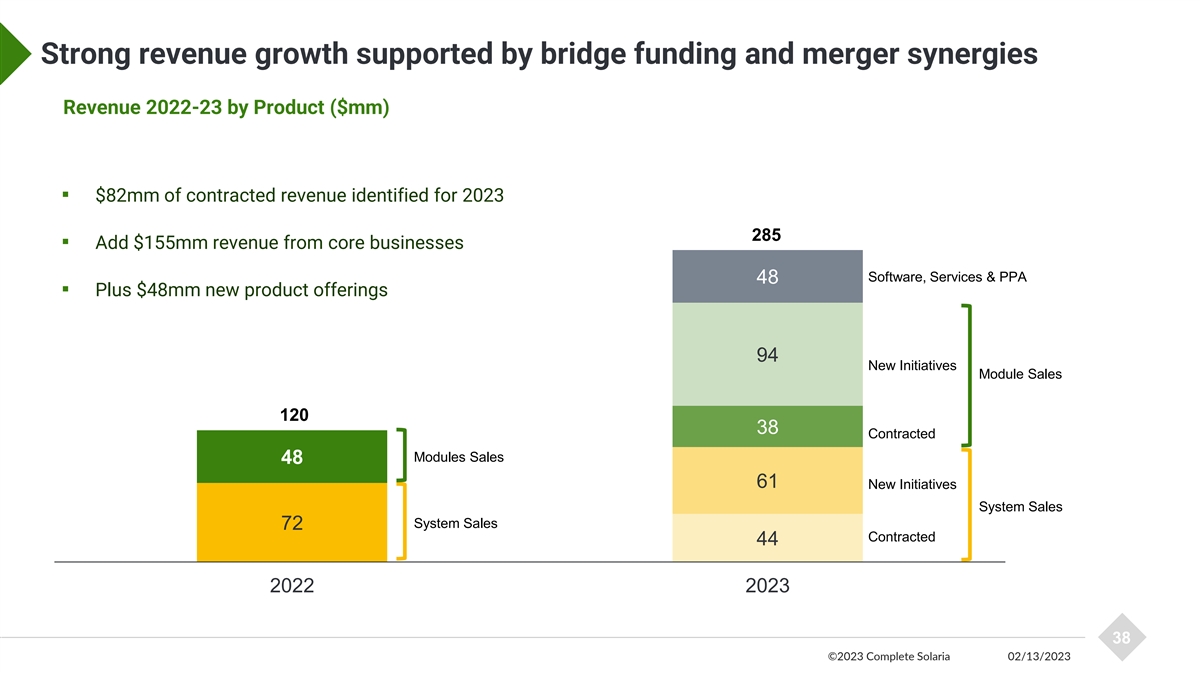 Strong revenue growth supported by bridge funding and merger synergies Revenue 2022-23 by Product ($mm) ▪ $82mm of contracted revenue identified for 2023 285 ▪ Add $155mm revenue from core businesses Software, Services & PPA 48 ▪ Plus $48mm new product offerings 94 New Initiatives Module Sales 120 38 Contracted Modules Sales 48 61 New Initiatives System Sales System Sales 72 Contracted 44 2022 2023 38 ©2023 Complete Solaria 02/13/2023