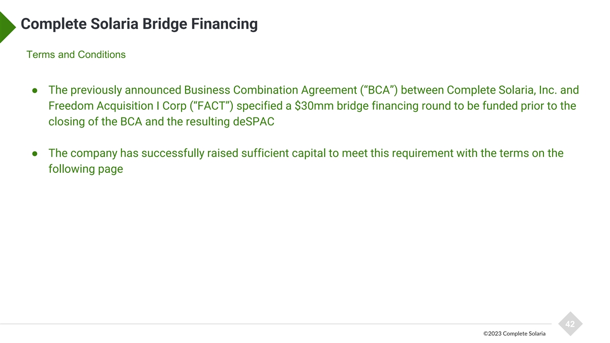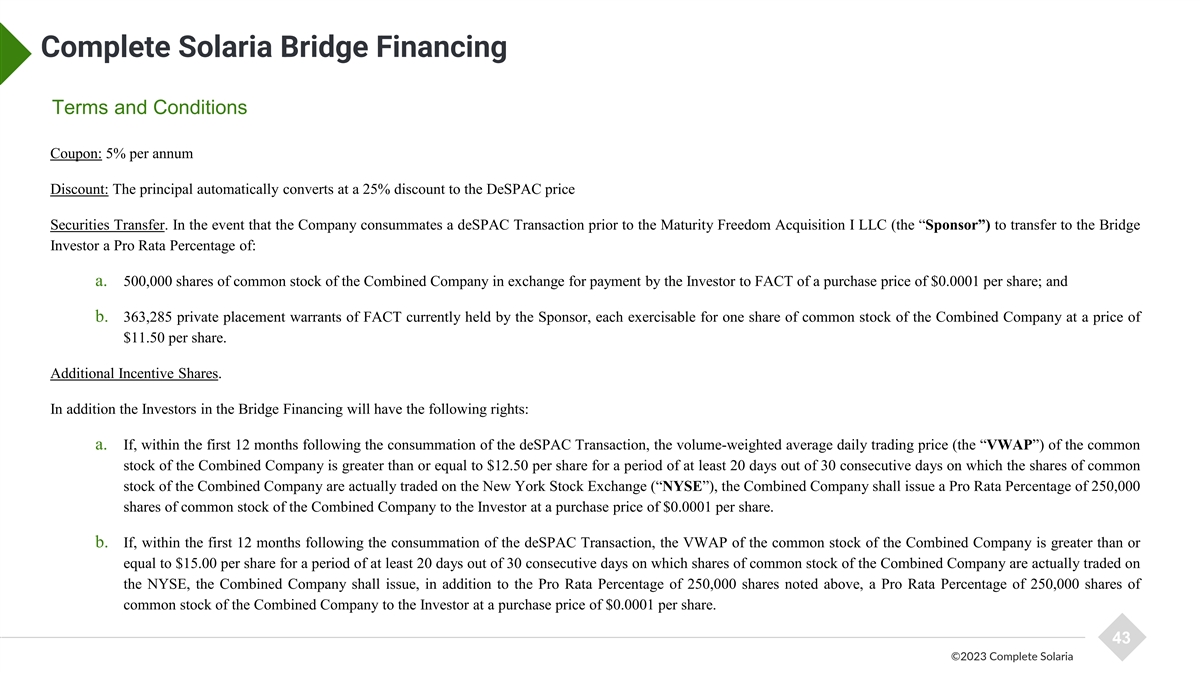 Complete Solaria Bridge Financing Terms and Conditions Coupon:5%perannum Discount: Theprincipal automatically converts at a25%discounttotheDeSPACprice Securities Transfer. In the event that the Company consummates a deSPAC Transaction prior to the Maturity Freedom Acquisition I LLC (the“Sponsor”) to transfer to the Bridge Investor aProRata Percentage of: a. 500,000shares ofcommonstockoftheCombined Companyinexchange forpayment bytheInvestor toFACTofapurchase price of$0.0001pershare; and b. 363,285 private placement warrants of FACT currently held by the Sponsor, each exercisable for one share of common stock of the Combined Company at a price of $11.50pershare. Additional Incentive Shares. In addition theInvestors intheBridge Financing willhave thefollowingrights: a. If, within the first 12 months following the consummation of the deSPAC Transaction, the volume-weighted average daily trading price (the“VWAP”) of the common stock of the Combined Companyis greater than or equal to $12.50 per share for a period of at least 20 days out of 30 consecutive days on which the shares of common stockoftheCombinedCompanyare actuallytradedon theNewYork StockExchange(“NYSE”),theCombinedCompanyshall issueaProRataPercentage of250,000 shares ofcommon stockoftheCombined Companyto theInvestor atapurchase price of$0.0001pershare. b. If, within the first 12 months following the consummation of the deSPAC Transaction, the VWAP of the common stock of the Combined Company is greater than or equal to$15.00pershare for aperiodofat least 20days out of30 consecutive days onwhich shares ofcommonstock of the CombinedCompanyare actuallytraded on the NYSE, the Combined Company shall issue, in addition to the Pro Rata Percentage of 250,000 shares noted above, a Pro Rata Percentage of 250,000 shares of common stockoftheCombinedCompanytotheInvestor at apurchase price of$0.0001pershare. 43 ©2023 Complete Solaria