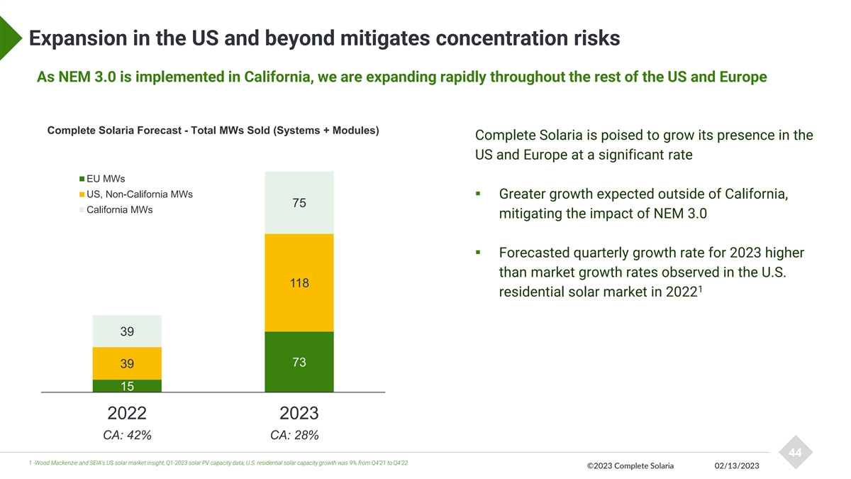 Expansion in the US and beyond mitigates concentration risks As NEM 3.0 is implemented in California, we are expanding rapidly throughout the rest of the US and Europe Complete Solaria Forecast - Total MWs Sold (Systems + Modules) Complete Solaria is poised to grow its presence in the US and Europe at a significant rate EU MWs US, Non-California MWs ▪ Greater growth expected outside of California, 75 California MWs mitigating the impact of NEM 3.0 ▪ Forecasted quarterly growth rate for 2023 higher than market growth rates observed in the U.S. 118 1 residential solar market in 2022 39 73 39 15 2022 2023 CA: 42% CA: 28% 44 1 -Wood Mackenzie and SEIA's US solar market insight, Q1-2023 solar PV capacity data; U.S. residential solar capacity growth was 9% from Q4’21 to Q4’22 ©2023 Complete Solaria 02/13/2023