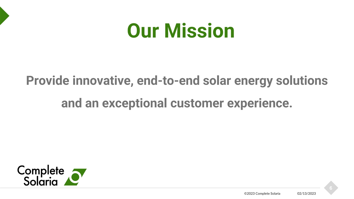 Today’s Agenda 1. Welcome Remarks Will Anderson, CEO 2. FACT Investment Thesis Tidjane Thiam, Executive Chairman, Freedom Acquisition I Corp. 3. Company Overview and Differentiators Will Anderson, CEO 4. Complete Solaria Growth Strategy Vikas Desai, President, Solaria Mark Swanson, COO, Solaria 5. Financial Information Brian Wuebbels, CFO 5 ©2023 Complete Solaria 02/13/2023