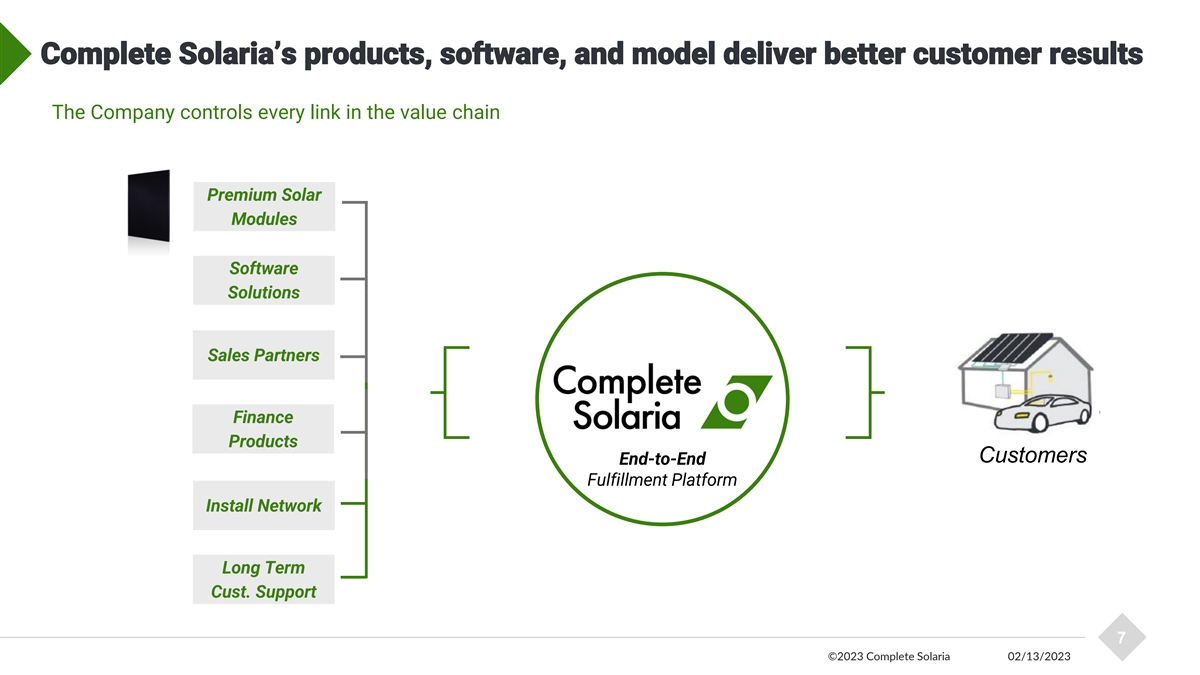 Our Mission Provide innovative, end-to-end solar energy solutions and an exceptional customer experience. 6 ©2023 Complete Solaria 02/13/2023