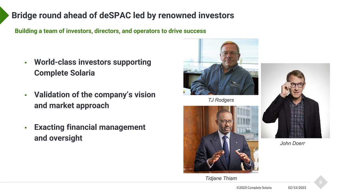 Combining capabilities and capital to drive successful results Merger and deSPAC Announcement Complete Solaria, FREEDOM Complete Solaria is ACQUISITION Inc. is born out of CORPORATION undergoing a the recent merger deSPAC transaction between Complete with Freedom Solar, Inc. and The Acquisition I Corp. Complete system Premium panels: Solaria Corporation provider: sales, All-black, high-power Become a new leader in distributed solar installation, O&M, and panels distributed digital customer through 1,306 Pro TM interface Partners Complete Solaria is a new solar company that creates one-stop shopping demanded by customers 8 ©2023 Complete Solaria 02/13/2023