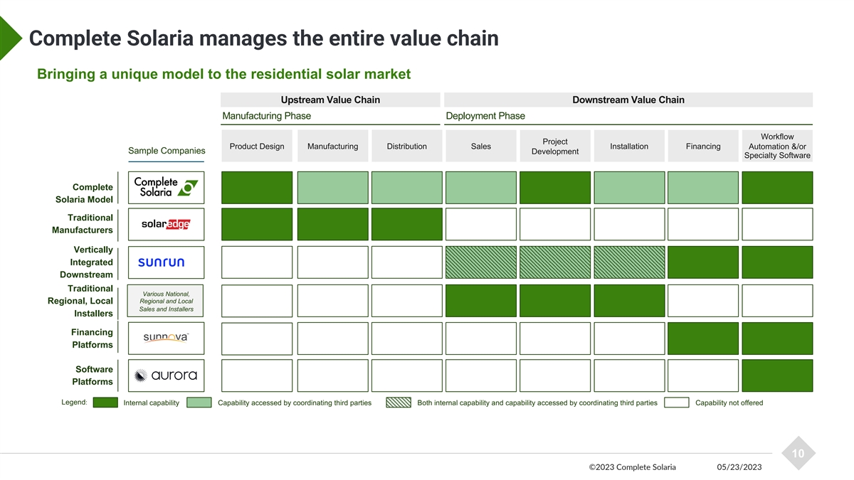 Complete Solaria’s products, software, and model deliver better customer results An end-to-end customer experience Premium Solar Modules Software Solutions Sales Partners Finance Products Customers End-to-End Fulfillment Platform Install Network Long Term Cust. Support 9 ©2023 Complete Solaria 05/23/2023